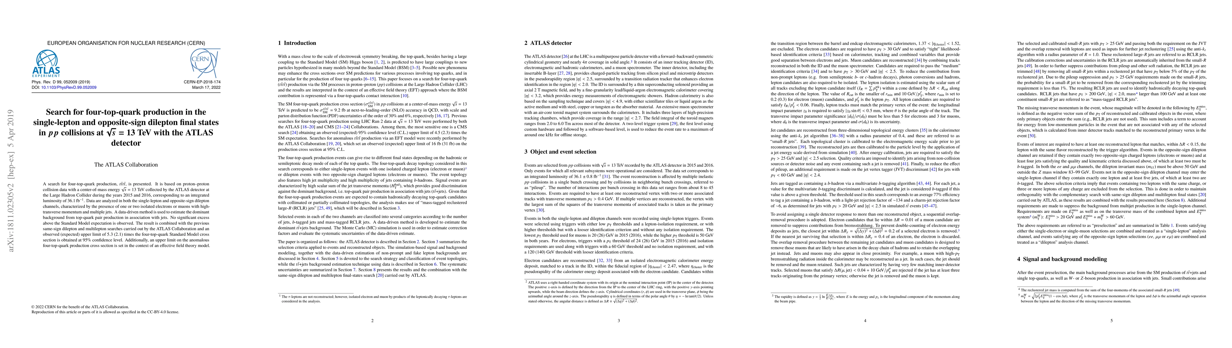 A search for four-top-quark production, $t\bar{t}t\bar{t}$, is presented. It is based on proton-proton collision data with a center-of-mass energy $\sqrt{s}$ = 13 TeV collected by the ATLAS detector at the Large Hadron Collider during the year 2015 and 2016, corresponding to an integrated luminosity of $36.1$ fb$^{-1}$. Data are analyzed in both the single-lepton and opposite-sign dilepton channels, characterized by the presence of one or two isolated electrons or muons with high-transverse momentum and multiple jets. A data-driven method is used to estimate the dominant background from top-quark pair production in association with jets. No significant excess above the Standard Model expectation is observed. The result is combined with the previous same-sign dilepton and multilepton searches carried out by ATLAS and an observed (expected) upper limit of 5.3 (2.1) times the four-top-quark Standard Model cross section is obtained at 95% confidence level. Additionally, upper limit on anomalous four-top-quark production cross section is set in the context of an effective field theory model.