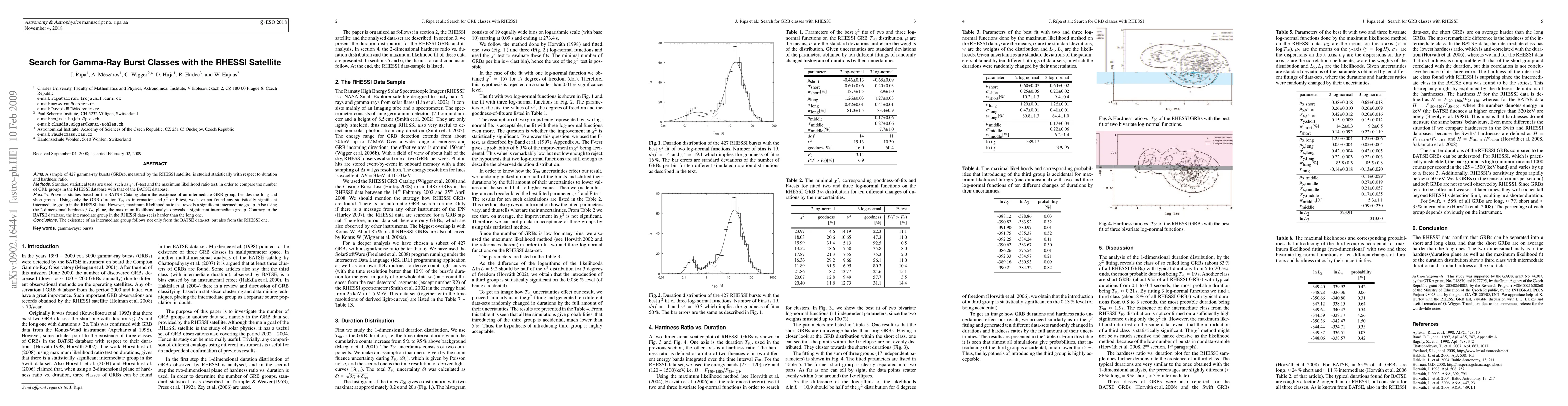 A sample of 427 gamma-ray bursts (GRBs), measured by the RHESSI satellite, is studied statistically with respect to duration and hardness ratio. Standard statistical tests are used, such as $\chi^2$, F-test and the maximum likelihood ratio test, in order to compare the number of GRB groups in the RHESSI database with that of the BATSE database. Previous studies based on the BATSE Catalog claim the existence of an intermediate GRB group, besides the long and short groups. Using only the GRB duration $T_{90}$ as information and $\chi^2$ or F-test, we have not found any statistically significant intermediate group in the RHESSI data. However, maximum likelihood ratio test reveals a significant intermediate group. Also using the 2-dimensional hardness / $T_{90}$ plane, the maximum likelihood analysis reveals a significant intermediate group. Contrary to the BATSE database, the intermediate group in the RHESSI data-set is harder than the long one. The existence of an intermediate group follows not only from the BATSE data-set, but also from the RHESSI one.