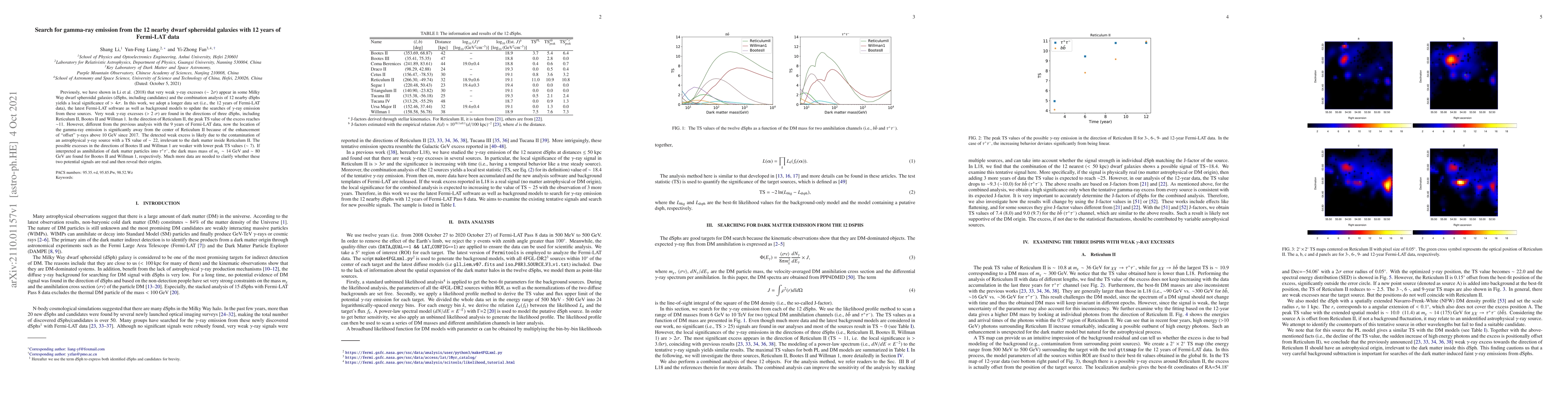 Researchers found gamma-ray emission from 3 nearby dwarf spheroidal galaxies using 12 years of Fermi-LAT data, suggesting possible dark matter annihilation signals with masses around 14-80 GeV.