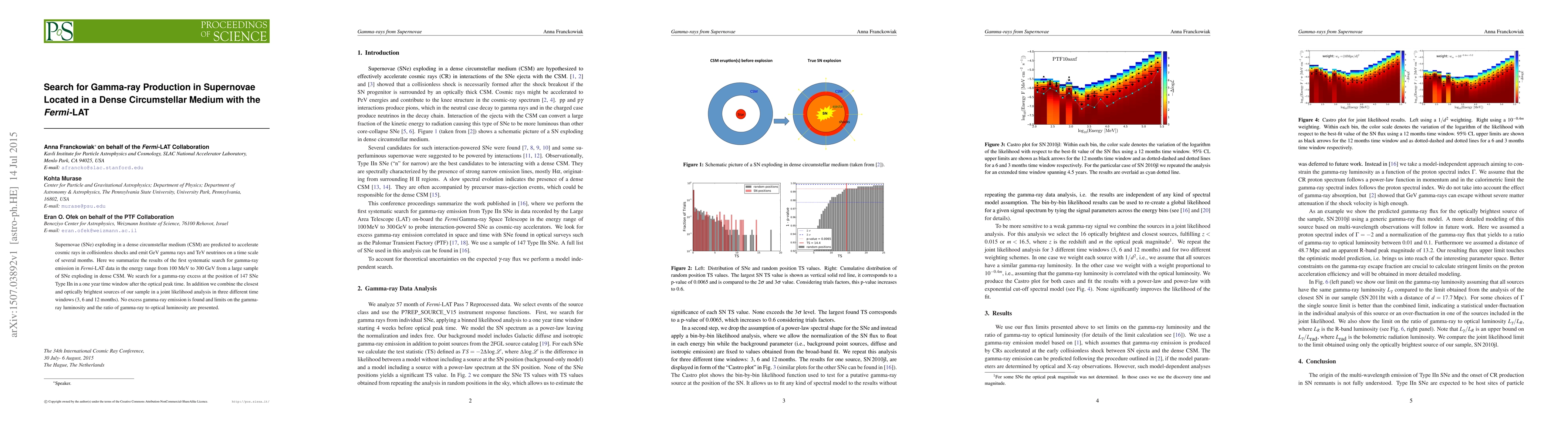Supernovae (SNe) exploding in a dense circumstellar medium (CSM) are predicted to accelerate cosmic rays in collisionless shocks and emit GeV gamma rays and TeV neutrinos on a time scale of several months. Here we summarize the results of the first systematic search for gamma-ray emission in Fermi-LAT data in the energy range from 100 MeV to 300 GeV from a large sample of SNe exploding in dense CSM. We search for a gamma-ray excess at the position of 147 SNe Type IIn in a one year time window after the optical peak time. In addition we combine the closest and optically brightest sources of our sample in a joint likelihood analysis in three different time windows (3, 6 and 12 months). No excess gamma-ray emission is found and limits on the gamma-ray luminosity and the ratio of gamma-ray to optical luminosity are presented.