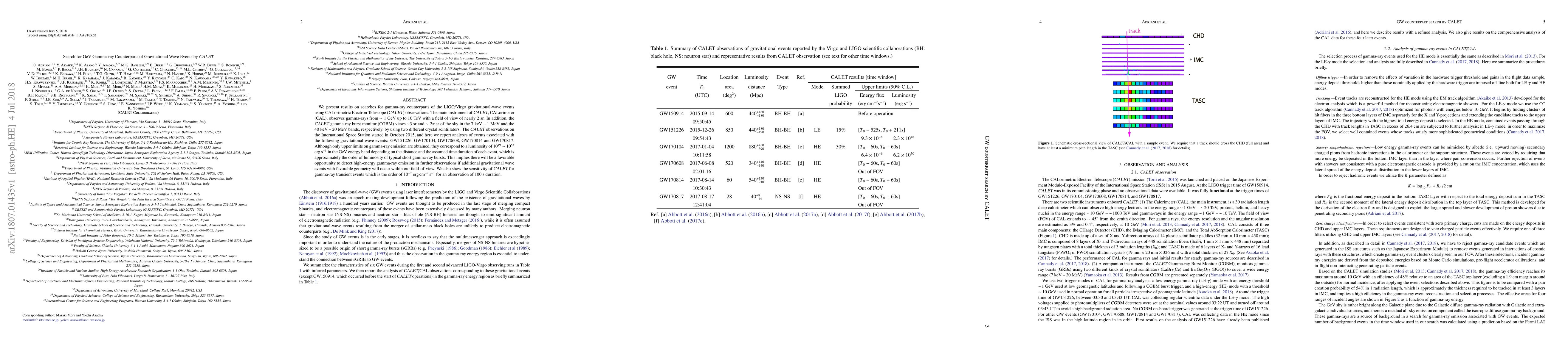 The CALET telescope on the International Space Station searched for GeV gamma-ray counterparts of five gravitational wave events (GW151226, GW170104, GW170608, GW170814, and GW170817). Although no gamma-ray emissions were detected, the upper limits suggest a luminosity comparable to typical short gamma-ray bursts, indicating potential for future detections with favorable event geometries.
