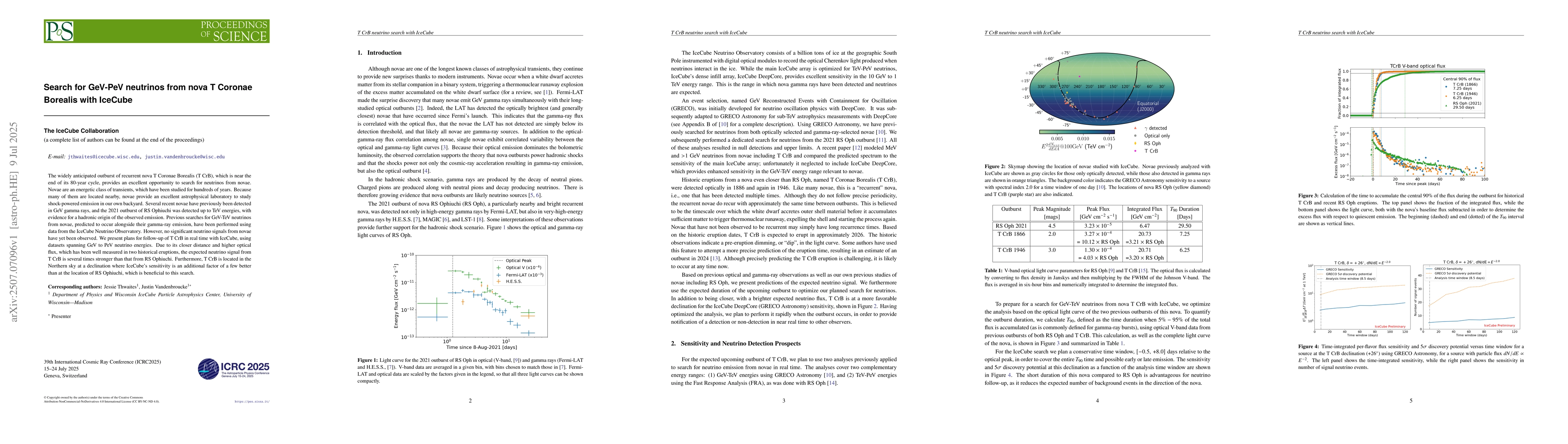 The widely anticipated outburst of recurrent nova T Coronae Borealis (T CrB), which is near the end of its 80-year cycle, provides an excellent opportunity to search for neutrinos from novae. Novae are an energetic class of transients, which have been studied for hundreds of years. Because many of them are located nearby, novae provide an excellent astrophysical laboratory to study shock-powered emission in our own backyard. Several recent novae have previously been detected in GeV gamma rays, and the 2021 outburst of RS Ophiuchi was detected up to TeV energies, with evidence for a hadronic origin of the observed emission. Previous searches for GeV-TeV neutrinos from novae, predicted to occur alongside their gamma-ray emission, have been performed using data from the IceCube Neutrino Observatory. However, no significant neutrino signals from novae have yet been observed. We present plans for follow-up of T CrB in real time with IceCube, using datasets spanning GeV to PeV neutrino energies. Due to its closer distance and higher optical flux, which has been well measured in two historical eruptions, the expected neutrino signal from T CrB is several times stronger than that from RS Ophiuchi. Furthermore, T CrB is located in the Northern sky at a declination where IceCube's sensitivity is an additional factor of a few better than at the location of RS Ophiuchi, which is beneficial to this search.