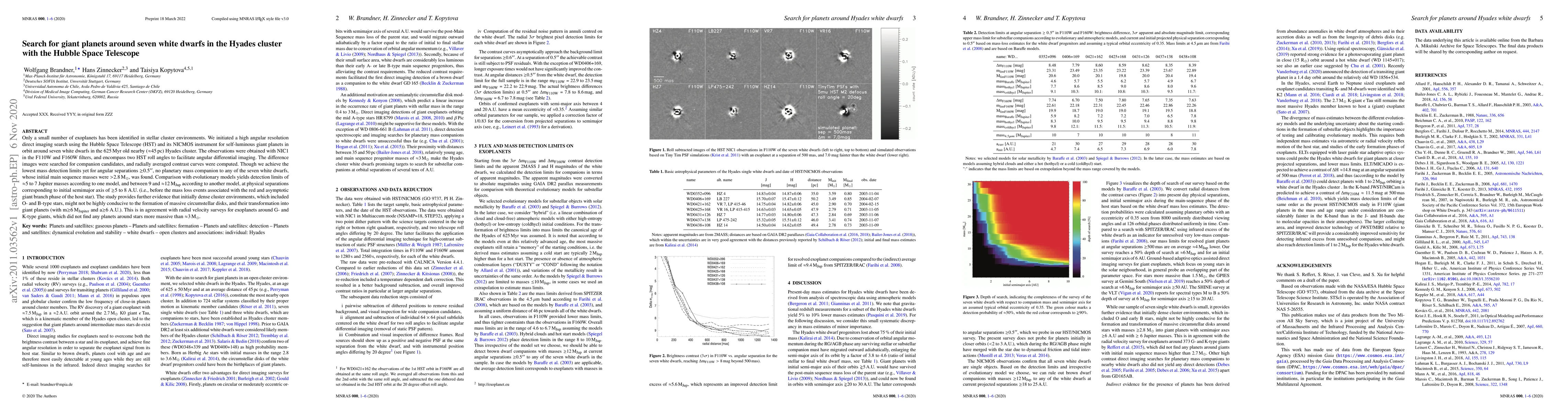 This study used the Hubble Space Telescope to search for giant planets around seven white dwarfs in the Hyades cluster, finding no evidence of such planets. The results suggest that dense cluster environments may not foster the formation of massive circumstellar disks and giant planets.