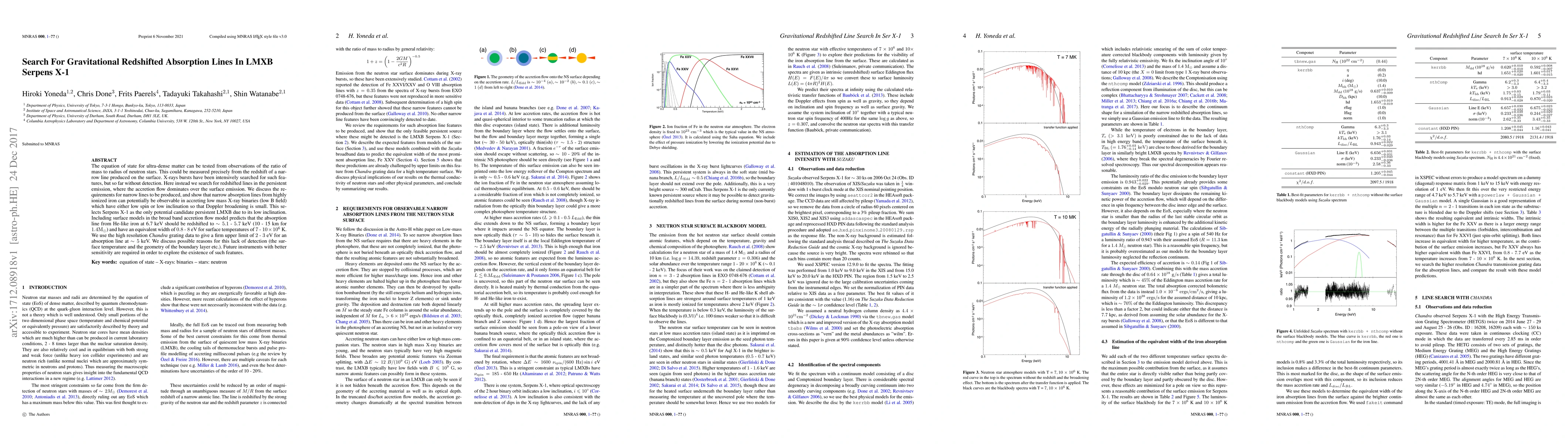 The equation of state for ultra-dense matter can be tested from observations of the ratio of mass to radius of neutron stars. This could be measured precisely from the redshift of a narrow line produced on the surface. X-rays bursts have been intensively searched for such features, but so far without detection. Here instead we search for redshifted lines in the persistent emission, where the accretion flow dominates over the surface emission. We discuss the requirements for narrow lines to be produced, and show that narrow absorption lines from highly ionized iron can potentially be observable in accreting low mass X-ray binaries (low B field) which have either low spin or low inclination so that Doppler broadening is small. This selects Serpens X-1 as the only potential candidate persistent LMXB due to its low inclination. Including surface models in the broad band accretion flow model predicts that the absorption line from He-like iron at 6.7 keV should be redshifted to $\sim$ 5.1 - 5.7 keV (10 - 15 km for $1.4\mathrm{M_\odot}$) and have an equivalent width of 0.8 - 8.0 eV for surface temperatures of 7 - 10 $\times$ 10$^6$ K. We use the high resolution Chandra grating data to give a firm upper limit of 2 - 3 eV for an absorption line at $\sim 5$ keV. We discuss possible reasons for this lack of detection (the surface temperature and the geometry of the boundary layer etc.). Future instruments with better sensitivity are required in order to explore the existence of such features.