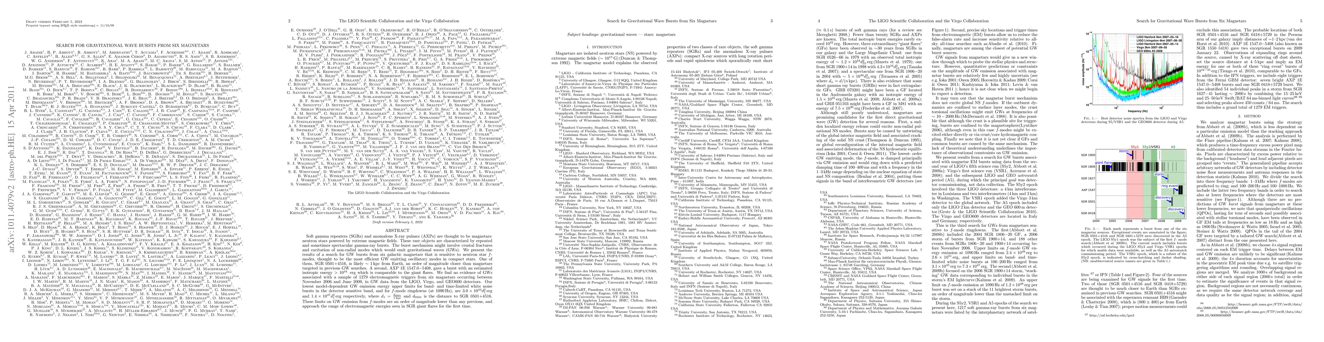 Soft gamma repeaters (SGRs) and anomalous X-ray pulsars (AXPs) are thought to be magnetars: neutron stars powered by extreme magnetic fields. These rare objects are characterized by repeated and sometimes spectacular gamma-ray bursts. The burst mechanism might involve crustal fractures and excitation of non-radial modes which would emit gravitational waves (GWs). We present the results of a search for GW bursts from six galactic magnetars that is sensitive to neutron star f-modes, thought to be the most efficient GW emitting oscillatory modes in compact stars. One of them, SGR 0501+4516, is likely ~1 kpc from Earth, an order of magnitude closer than magnetars targeted in previous GW searches. A second, AXP 1E 1547.0-5408, gave a burst with an estimated isotropic energy >10^{44} erg which is comparable to the giant flares. We find no evidence of GWs associated with a sample of 1279 electromagnetic triggers from six magnetars occurring between November 2006 and June 2009, in GW data from the LIGO, Virgo, and GEO600 detectors. Our lowest model-dependent GW emission energy upper limits for band- and time-limited white noise bursts in the detector sensitive band, and for f-mode ringdowns (at 1090 Hz), are 3.0x10^{44} d_1^2 erg and 1.4x10^{47} d_1^2 erg respectively, where d_1 = d_{0501} / 1 kpc and d_{0501} is the distance to SGR 0501+4516. These limits on GW emission from f-modes are an order of magnitude lower than any previous, and approach the range of electromagnetic energies seen in SGR giant flares for the first time.