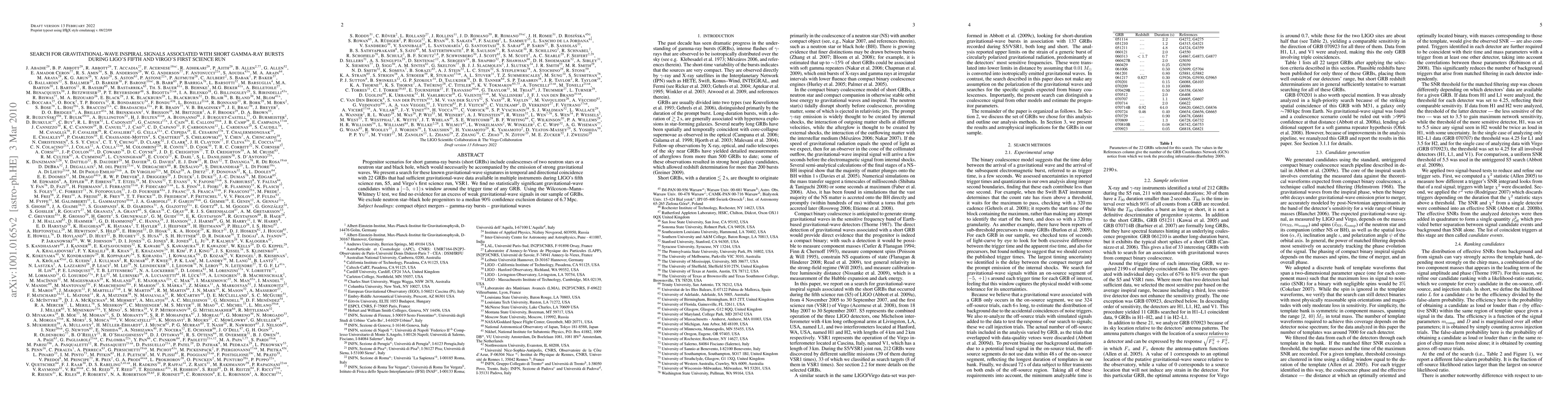 The study searched for gravitational-wave signals from neutron star or neutron star-black hole mergers during LIGO's fifth and Virgo's first science run, finding no significant gravitational-wave candidates coincident with 22 short gamma-ray bursts, and excluding neutron star-black hole progenitors up to a median distance of 6.7 Mpc.