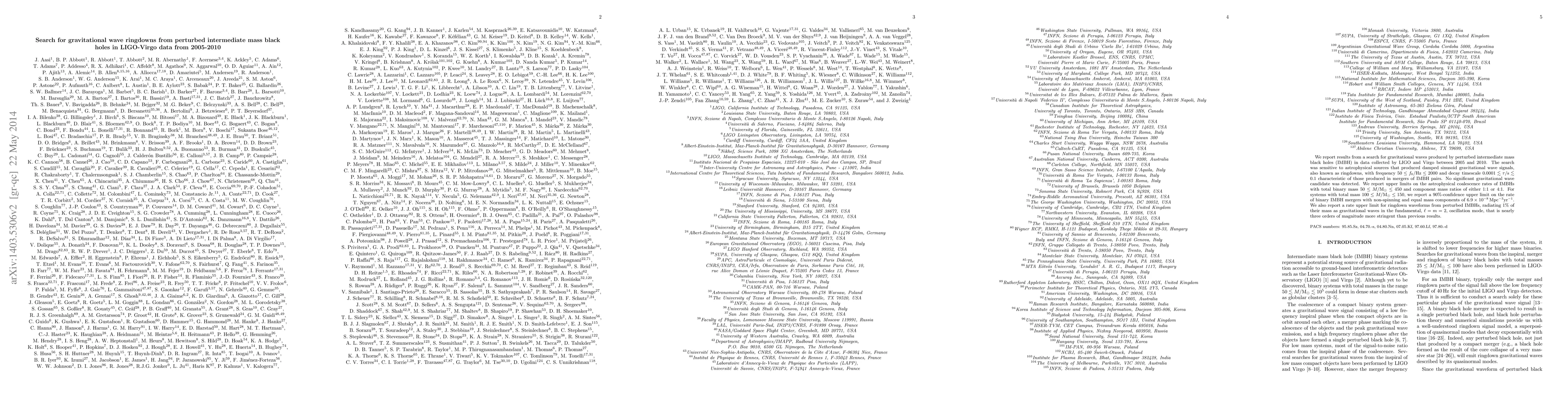Researchers searched for gravitational waves from perturbed intermediate mass black holes in LIGO-Virgo data from 2005-2010, setting a new stringent upper limit on the rate of binary mergers and finding no significant candidates.