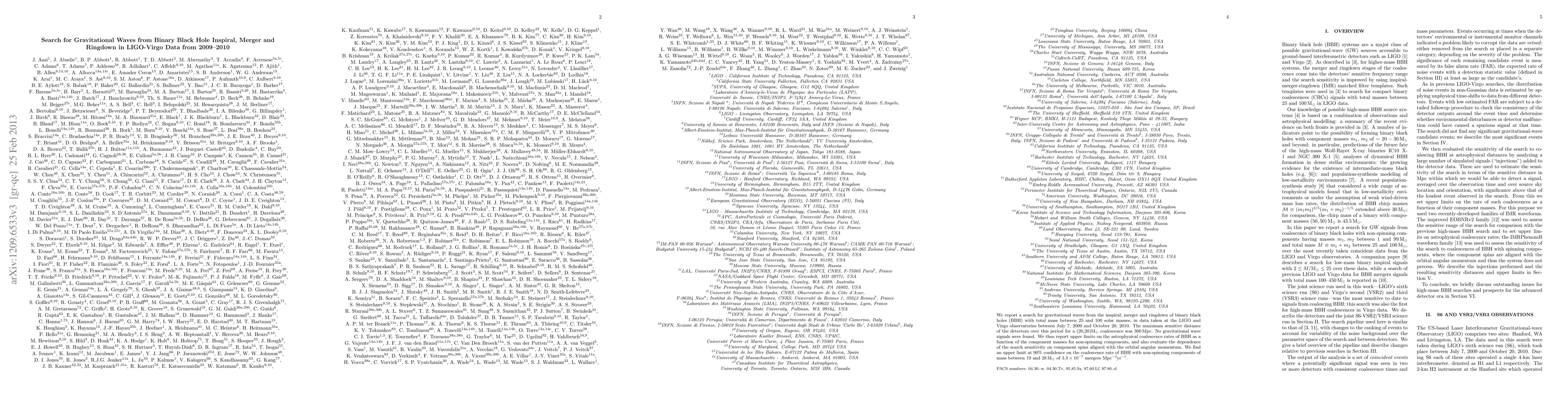 This paper reports a search for gravitational waves from binary black hole mergers in LIGO-Virgo data from 2009-2010, finding no signals. It establishes upper limits on the coalescence rates of such events, particularly for non-spinning black holes.