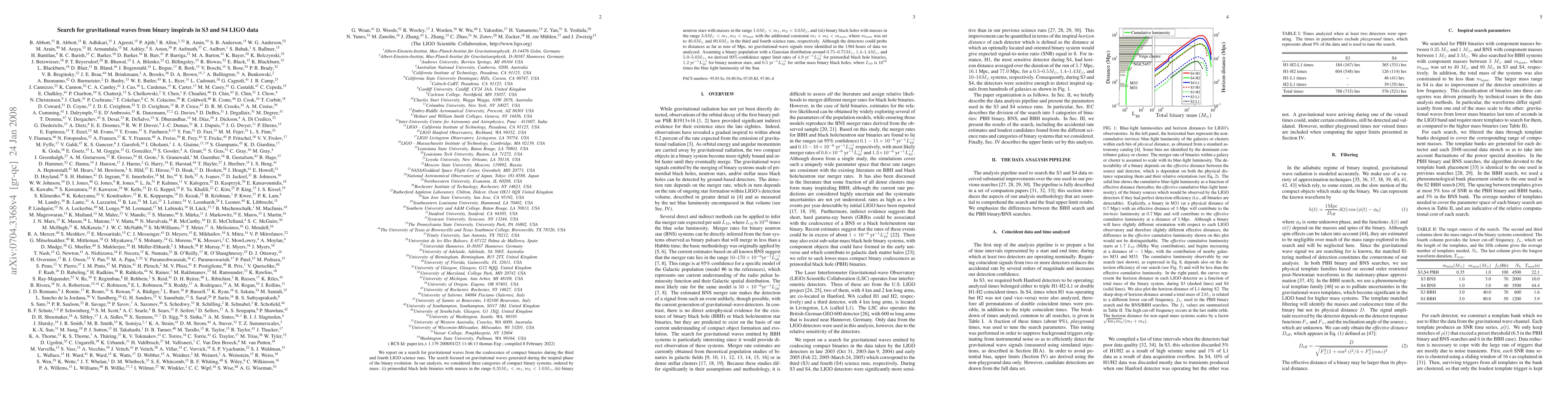 We report on a search for gravitational waves from the coalescence of compact binaries during the third and fourth LIGO science runs. The search focused on gravitational waves generated during the inspiral phase of the binary evolution. In our analysis, we considered three categories of compact binary systems, ordered by mass: (i) primordial black hole binaries with masses in the range 0.35 M(sun) < m1, m2 < 1.0 M(sun), (ii) binary neutron stars with masses in the range 1.0 M(sun) < m1, m2 < 3.0 M(sun), and (iii) binary black holes with masses in the range 3.0 M(sun)< m1, m2 < m_(max) with the additional constraint m1+ m2 < m_(max), where m_(max) was set to 40.0 M(sun) and 80.0 M(sun) in the third and fourth science runs, respectively. Although the detectors could probe to distances as far as tens of Mpc, no gravitational-wave signals were identified in the 1364 hours of data we analyzed. Assuming a binary population with a Gaussian distribution around 0.75-0.75 M(sun), 1.4-1.4 M(sun), and 5.0-5.0 M(sun), we derived 90%-confidence upper limit rates of 4.9 yr^(-1) L10^(-1) for primordial black hole binaries, 1.2 yr^(-1) L10^(-1) for binary neutron stars, and 0.5 yr^(-1) L10^(-1) for stellar mass binary black holes, where L10 is 10^(10) times the blue light luminosity of the Sun.