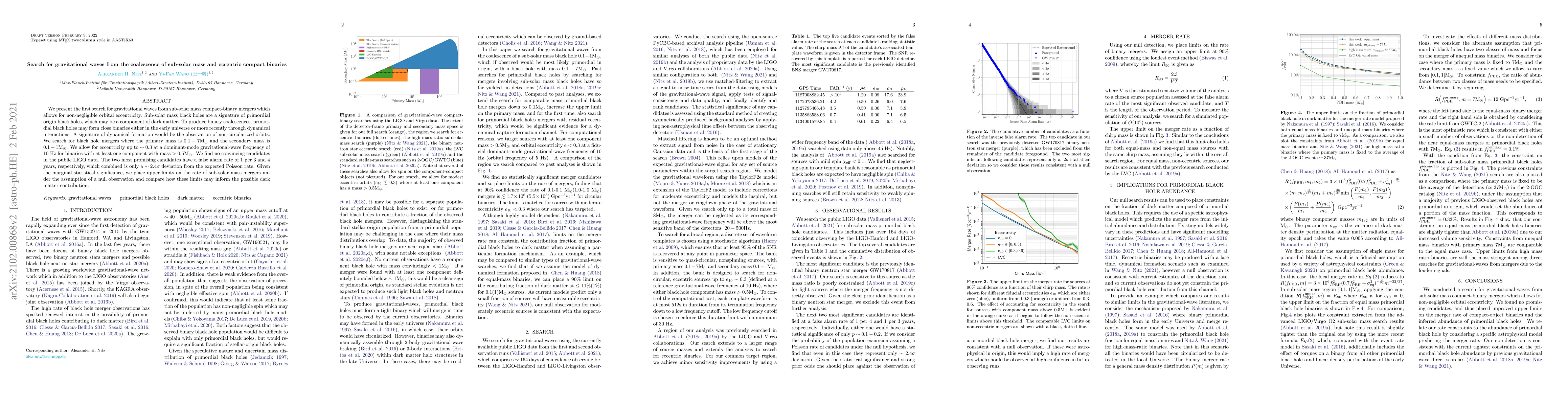This paper reports the first search for gravitational waves from sub-solar mass black hole mergers with significant orbital eccentricity, aiming to detect primordial black holes potentially contributing to dark matter. No convincing candidates were found, leading to upper limits on the merger rate that inform on the dark matter component.
