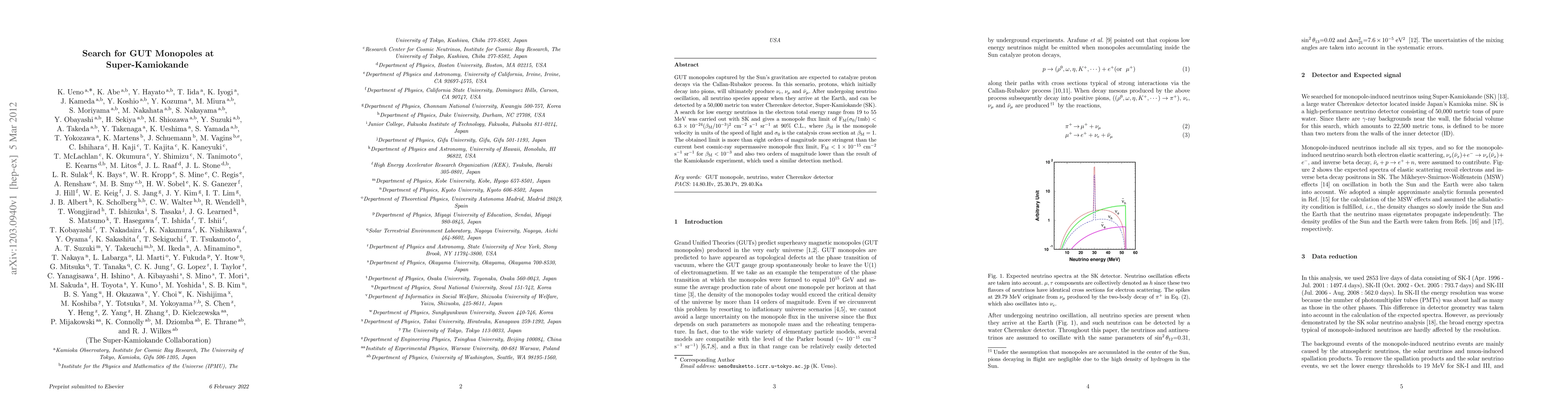 The research paper presents a search for Grand Unified Theory (GUT) monopoles using Super-Kamiokande, a large water Cherenkov detector. By analyzing low-energy neutrinos from hypothesized proton decays caused by monopole catalysis, the study sets a stringent upper limit on monopole flux, exceeding previous limits by more than eight orders of magnitude. This result significantly constrains models involving GUT monopoles and their potential impact on proton decay.