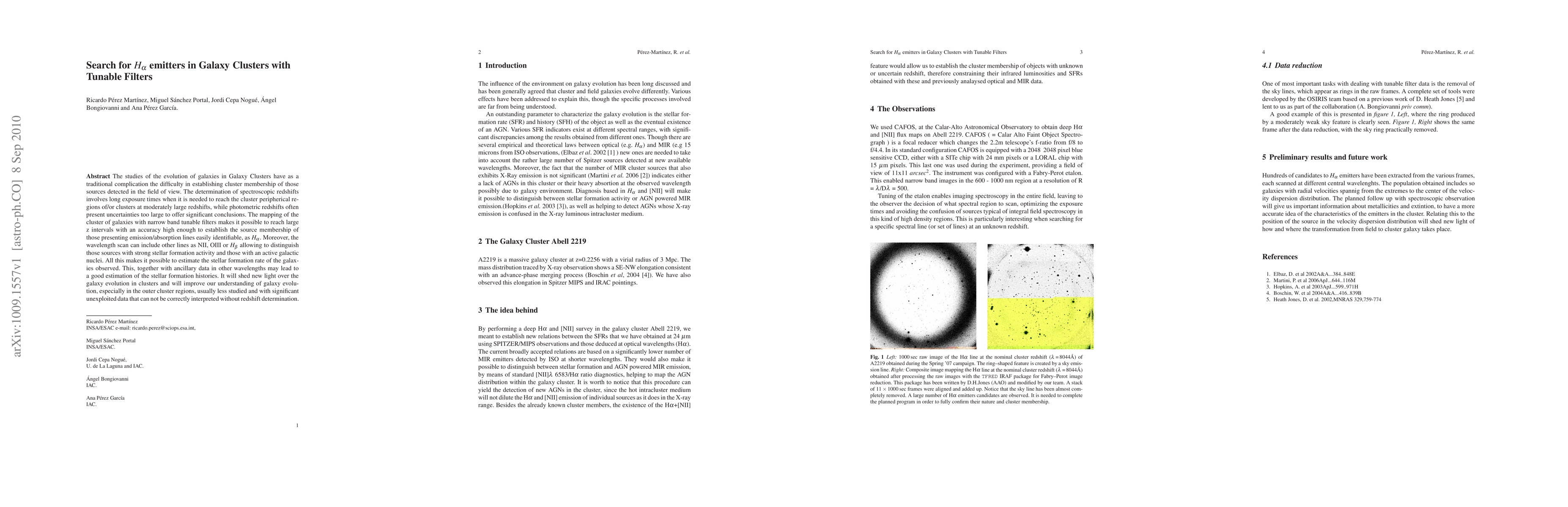 The studies of the evolution of galaxies in Galaxy Clusters have as a traditional complication the difficulty in establishing cluster membership of those sources detected in the field of view. The determination of spectroscopic redshifts involves long exposure times when it is needed to reach the cluster peripherical regions of/or clusters at moderately large redshifts, while photometric redshifts often present uncertainties too large to offer significant conclusions. The mapping of the cluster of galaxies with narrow band tunable filters makes it possible to reach large redshifts intervals with an accuracy high enough to establish the source membership of those presenting emission/absorption lines easily identifiable, as H alpha. Moreover, the wavelength scan can include other lines as [NII], [OIII] or $H_{\beta}$ allowing to distinguish those sources with strong stellar formation activity and those with an active galactic nuclei. All this makes it possible to estimate the stellar formation rate of the galaxies observed. This, together with ancillary data in other wavelengths may lead to a good estimation of the stellar formation histories. It will shed new light over the galaxy evolution in clusters and will improve our understanding of galaxy evolution, especially in the outer cluster regions, usually less studied and with significant unexploited data that can not be correctly interpreted without redshift determination.
