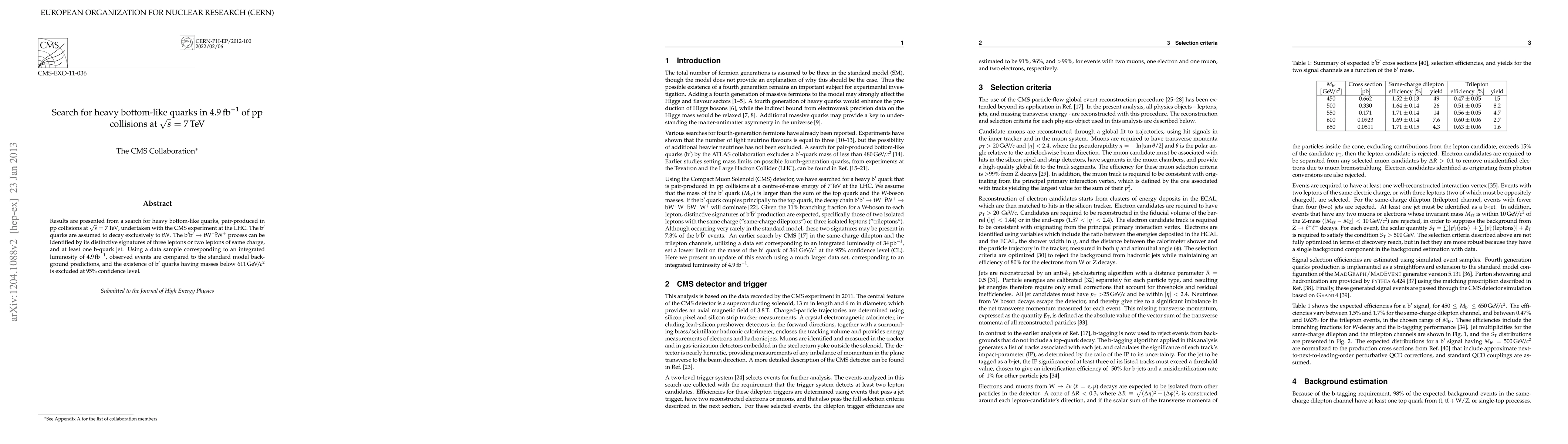 This paper reports a search for heavy bottom-like quarks (b') in proton-proton collisions at 7 TeV using the CMS experiment at the LHC. The study excludes the existence of b' quarks with masses below 611 GeV at 95% confidence level, based on an analysis of 4.9 inverse femtobarns of data.