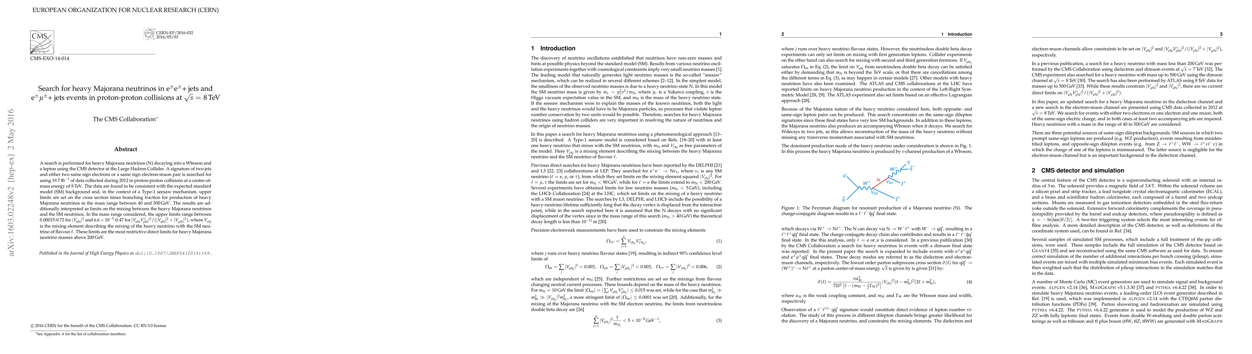 This research paper details a search for heavy Majorana neutrinos using the CMS detector at the Large Hadron Collider, analyzing proton-proton collision data from 2012. Findings show no evidence of Majorana neutrinos in the specified mass range (40-500 GeV), setting the most restrictive direct limits on their production above 200 GeV. These results are interpreted as constraints on mixing elements between heavy and Standard Model neutrinos.