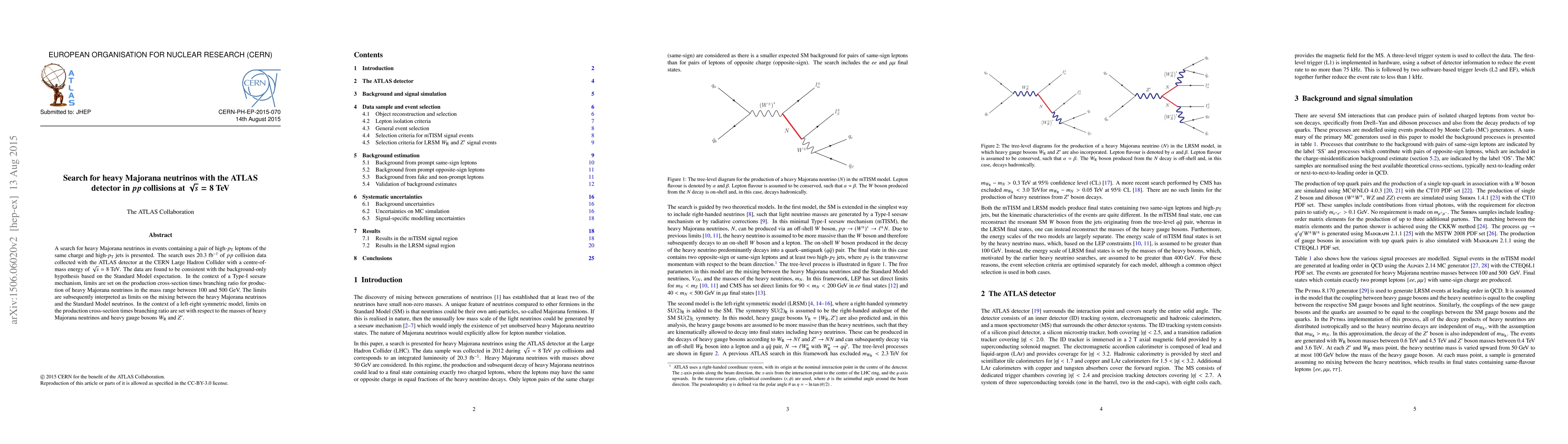 This paper reports a search for heavy Majorana neutrinos using the ATLAS detector in proton-proton collisions at 8 TeV, analyzing data consistent with Standard Model predictions. Limits are established on their production and mixing in both Type-I seesaw and left-right symmetric models.