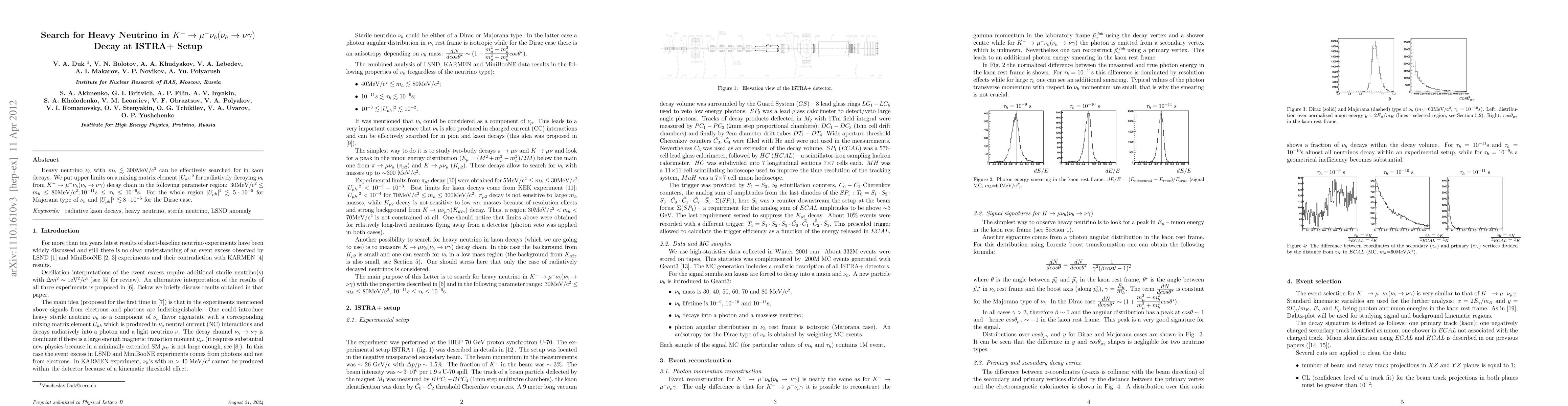 Heavy neutrino nu_h with m_h < 300MeV/c^2 can be effectively searched for in kaon decays. We put upper limits on mixing matrix element |U_mu_h}|^2 for radiatively decaying nu_h from K->mu nu_h (nu_h -> nu gamma) decay chain in the following parameter region: 30MeV/c^2 < m_h < 80MeV/c^2; 10^{-11}sec < tau_h < 10^{-9}sec. For the whole region |U_{mu h}|^2 < 5 x 10^{-5} for Majorana type of nu_h and | U_{\mu h}|^2 < 8 x 10^{-5} for the Dirac case.