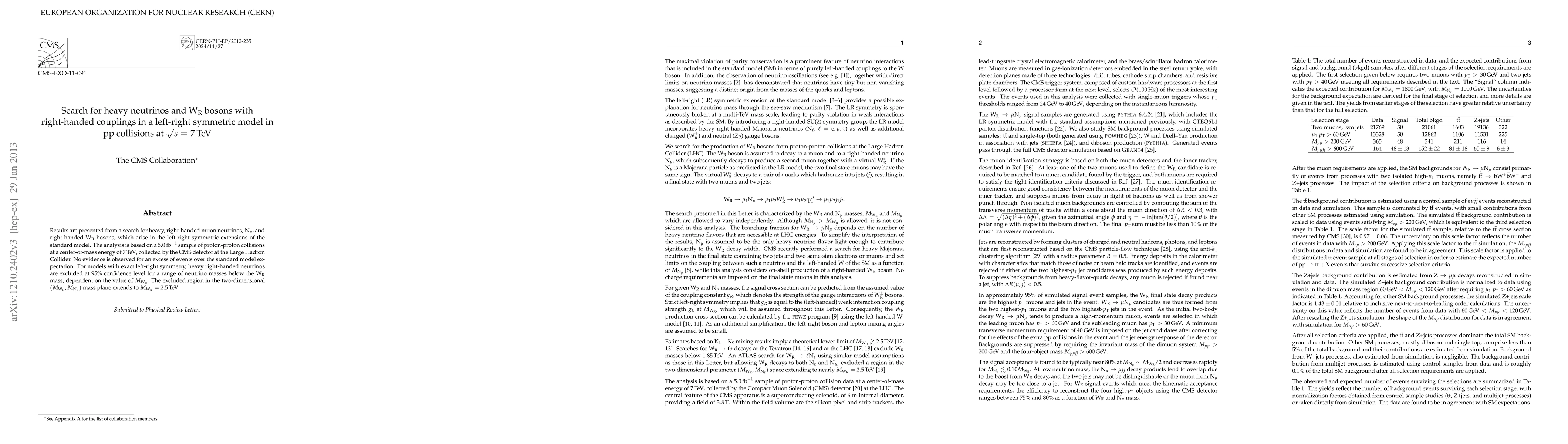 A search for heavy neutrinos and W[R] bosons with right-handed couplings in a left-right symmetric model found no evidence of an excess beyond the standard model expectation. Heavy right-handed neutrinos are excluded at 95% confidence level for certain masses below the W[R] mass threshold.