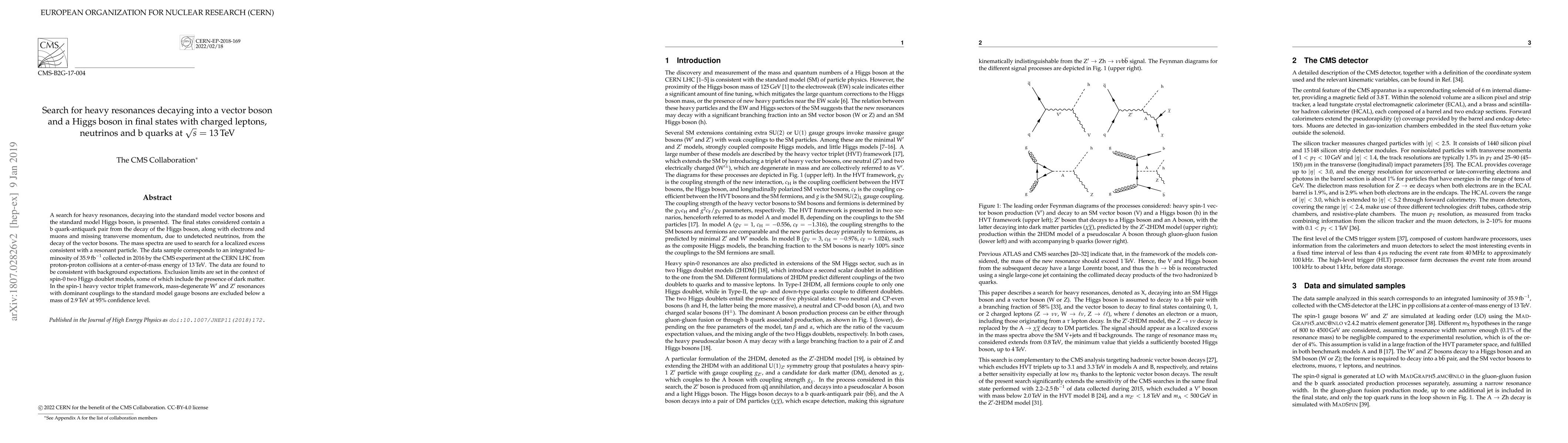 This paper reports a search for heavy resonances decaying into a vector boson and a Higgs boson using data from proton-proton collisions at 13 TeV, finding no evidence of such particles. Exclusion limits are established for spin-0 and spin-1 models, including scenarios involving dark matter.