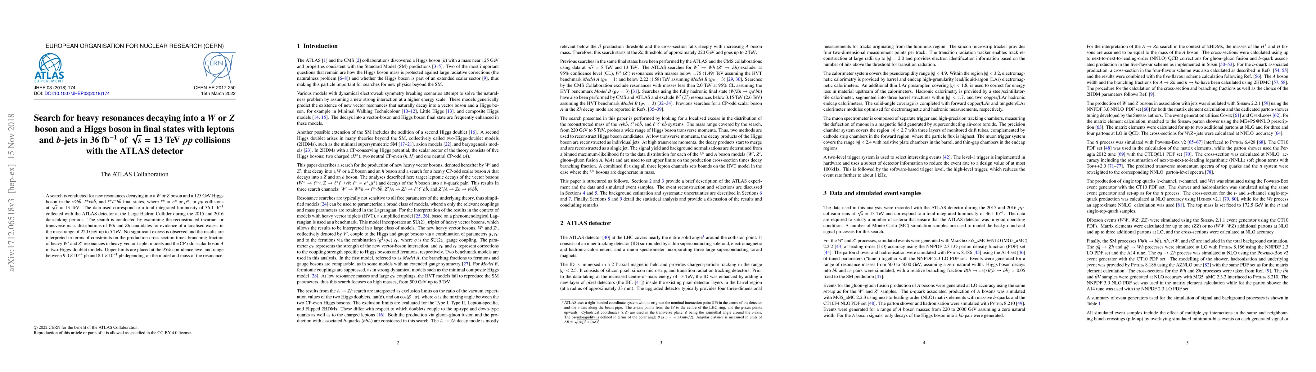 This paper investigates new heavy resonances decaying into a $W$ or $Z$ boson and a Higgs boson in various final states with leptons and $b$-jets using 36.1 fb$^{-1}$ of $pp$ collision data at $\sqrt{s} = 13$ TeV from the ATLAS detector. No significant excess is observed, leading to new upper limits on the production cross-section for heavy $W^\prime$, $Z^\prime$ resonances, and CP-odd scalar boson $A$.