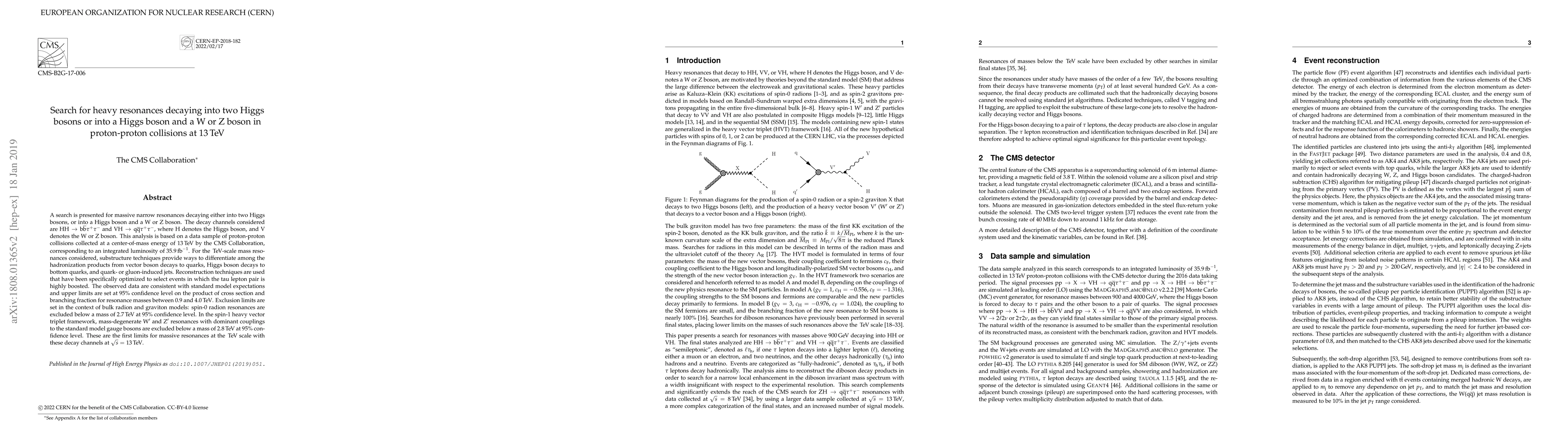This paper reports a search for heavy resonances decaying into Higgs bosons and W or Z bosons using proton-proton collision data at 13 TeV from the CMS Collaboration. No significant deviations from standard model predictions were observed, leading to new exclusion limits for spin-0 and spin-1 resonances up to 2.8 TeV.