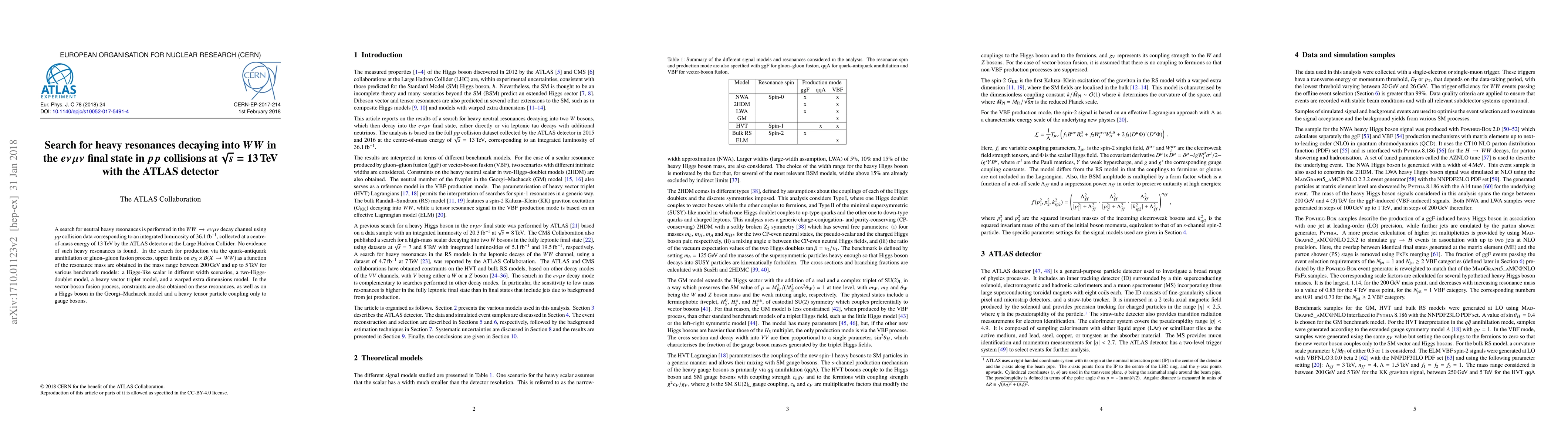 This paper reports a search for neutral heavy resonances decaying into $WW$ in the $e\nu\mu\nu$ final state using 36.1 fb$^{-1}$ of $pp$ collision data at 13 TeV from the ATLAS detector. No evidence of such resonances is found, leading to upper limits on production rates for various theoretical models.
