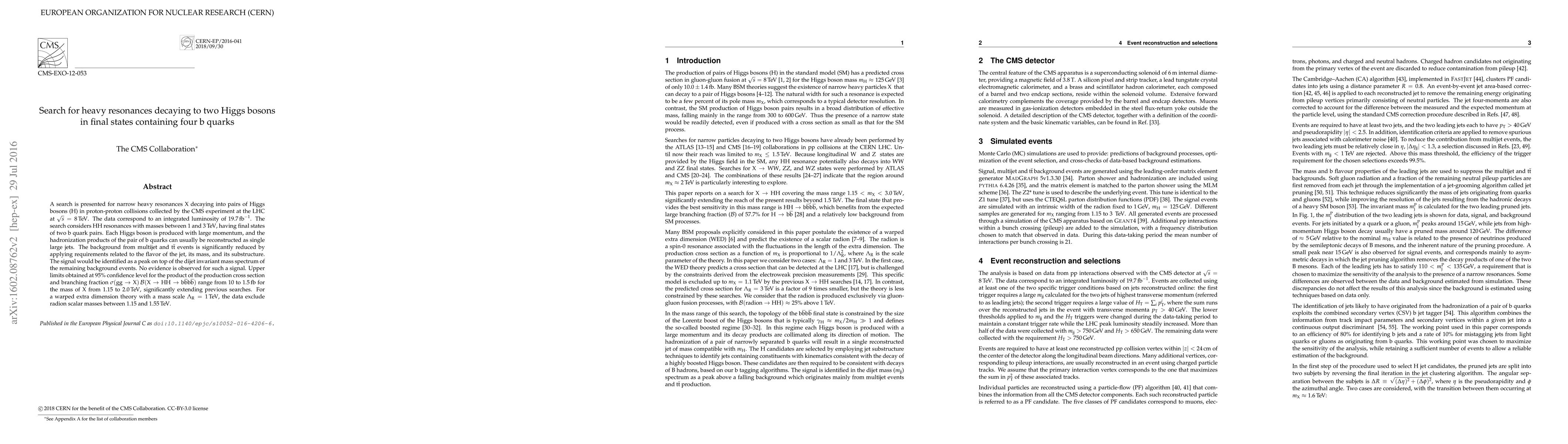 A search is presented for narrow heavy resonances X decaying into pairs of Higgs bosons (H) in proton-proton collisions collected by the CMS experiment at the LHC at sqrt(s) = 8 TeV. The data correspond to an integrated luminosity of 19.7 inverse femtobarns. The search considers HH resonances with masses between 1 and 3 TeV, having final states of two b quark pairs. Each Higgs boson is produced with large momentum, and the hadronization products of the pair of b quarks can usually be reconstructed as single large jets. The background from multijet and t t-bar events is significantly reduced by applying requirements related to the flavor of the jet, its mass, and its substructure. The signal would be identified as a peak on top of the dijet invariant mass spectrum of the remaining background events. No evidence is observed for such a signal. Upper limits obtained at 95% confidence level for the product of the production cross section and branching fraction sigma(gg to X) B(X to HH to b b-bar b b-bar) range from 10 to 1.5 fb for the mass of X from 1.15 to 2.0 TeV, significantly extending previous searches. For a warped extra dimension theory with a mass scale Lambda[R] = 1 TeV, the data exclude radion scalar masses between 1.15 and 1.55 TeV.
