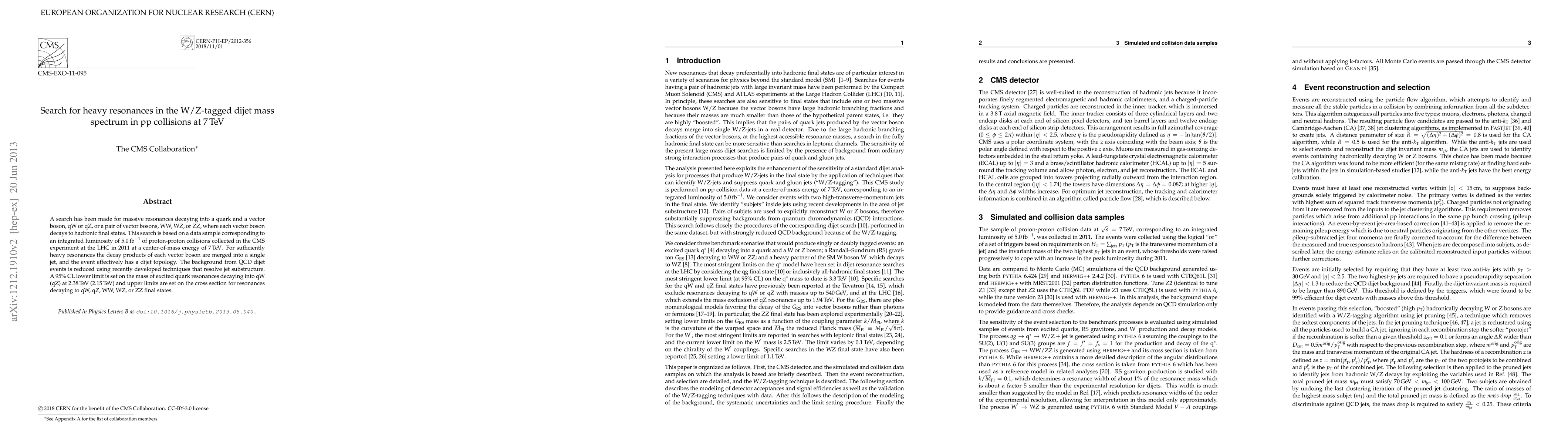 This paper reports a search for heavy resonances in proton-proton collisions at 7 TeV using the CMS experiment, focusing on dijet events from vector boson decays. No resonances are observed, leading to lower limits on excited quark masses and upper limits on the cross sections of various decay channels.