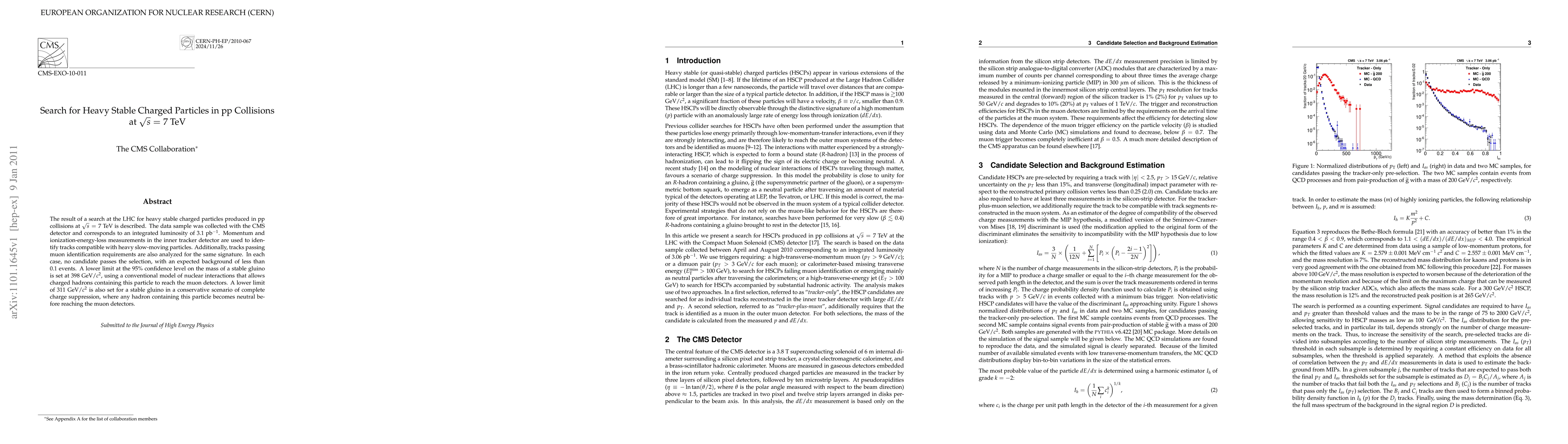 This paper reports a search for heavy stable charged particles in proton-proton collisions at 7 TeV using the CMS detector at the LHC, finding no candidates. A lower limit of 398 GeV/c² is set for the mass of a stable gluino under conventional models, and 311 GeV/c² under a scenario of complete charge suppression.