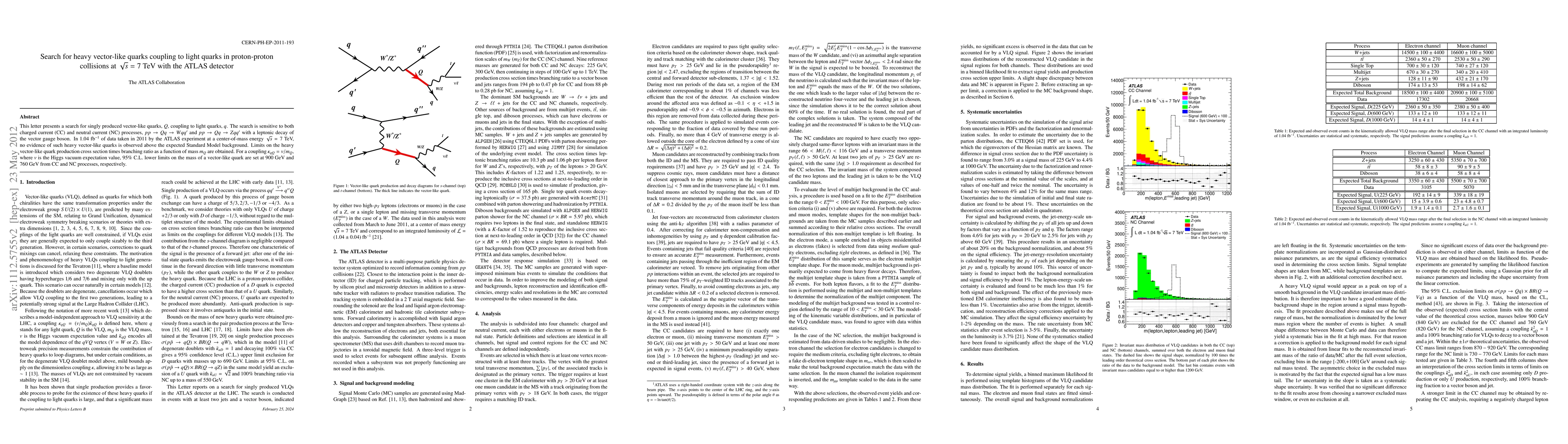 This letter presents a search for singly produced vector-like quarks, Q, coupling to light quarks, q. The search is sensitive to both charged current (CC) and neutral current (NC) processes, p p --> Q q --> W q q' and p p --> Q q --> Z q q' with a leptonic decay of the vector gauge boson. In 1.04/fb of data taken in 2011 by the ATLAS experiment at a center-of-mass energy sqrt(s) = 7 TeV, no evidence of such heavy vector-like quarks is observed above the expected Standard Model background. Limits on the heavy vector-like quark production cross section times branching ratio as a function of mass m_Q are obtained. For a coupling kappa_(qQ) = v/m_Q, where v is the Higgs vacuum expectation value, 95% C.L. lower limits on the mass of a vector-like quark are set at 900 GeV and 760 GeV from CC and NC processes, respectively.