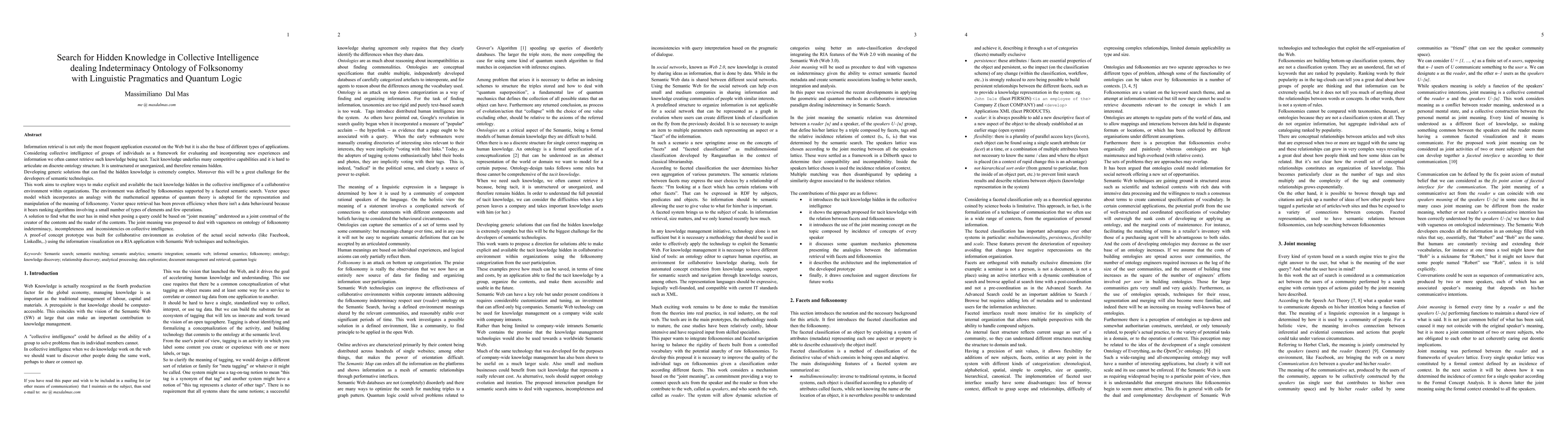 This paper explores methods to extract tacit knowledge from collective intelligence in collaborative environments using folksonomies and quantum logic. It proposes a vector space model incorporating quantum theory to address the indeterminacy and ambiguity in folksonomy ontologies, aiming to reveal hidden knowledge through joint meaning and semantic technologies.