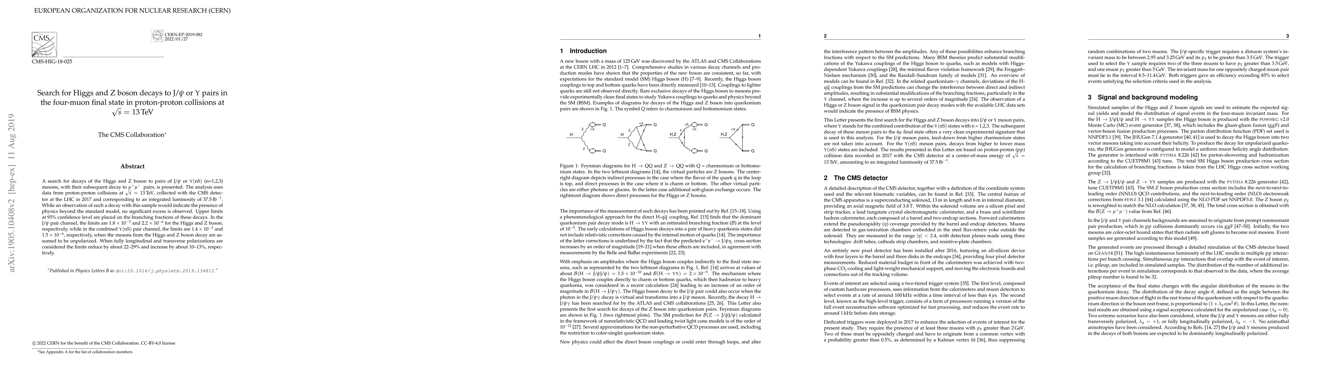 This study, using data from proton-proton collisions at the LHC's CMS detector, searched for Higgs and Z boson decays into pairs of J/$psi$ or $Upsilon$ mesons, which then decay to $mu^+mu^-$. No significant excess was found, leading to upper limits set at 95% confidence level: 1.8 $ imes$ 10$^{-3}$ and 2.2 $ imes$ 10$^{-6}$ for Higgs and Z boson J/$psi$ pairs, and 1.4 $ imes$ 10$^{-3}$ and 1.5 $ imes$ 10$^{-6}$ for $Upsilon$(nS) pairs, considering unpolarized mesons. Polarization effects slightly adjusted these limits.