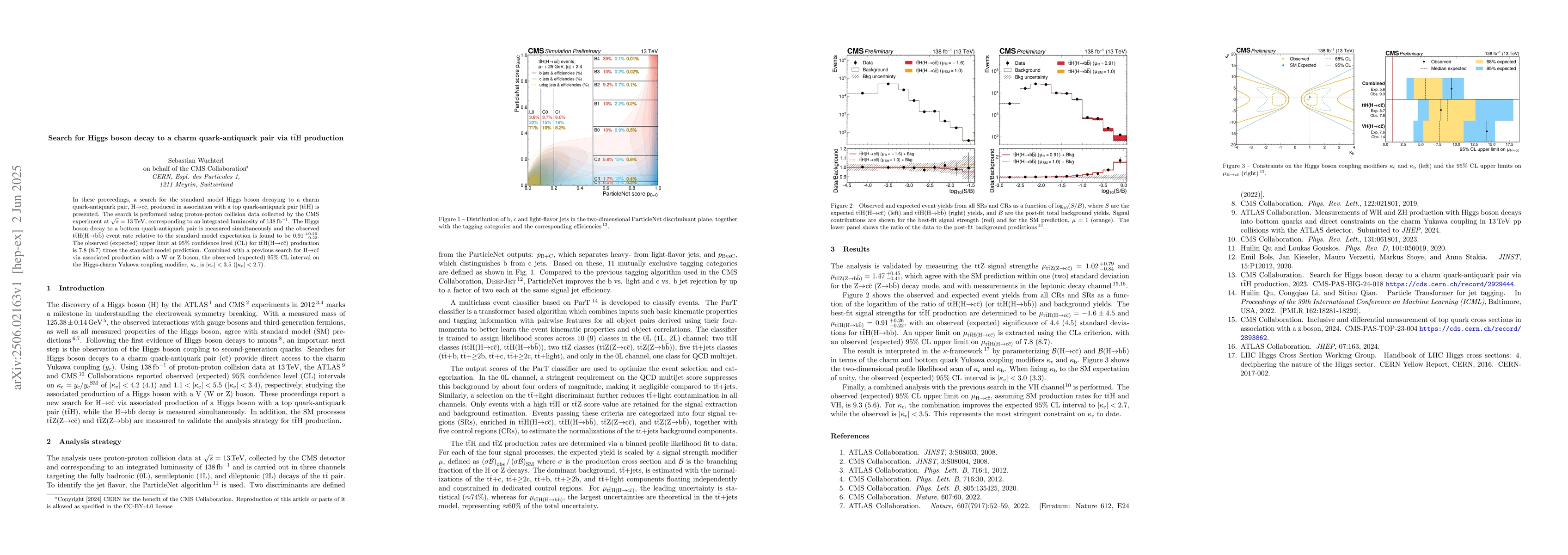 In these proceedings, a search for the standard model Higgs boson decaying to a charm quark-antiquark pair, $H\to c\bar{c}$, produced in association with a top quark-antiquark pair ($t\bar{tH}$) is presented. The search is performed using proton-proton collision data collected by the CMS experiment at $s=13$ TeV, corresponding to an integrated luminosity of 138 fb$^{-1}$. The Higgs boson decay to a bottom quark-antiquark pair is measured simultaneously and the observed $t\bar{tH(H\to bb)}$ event rate relative to the standard model expectation is found to be $0.91^{+0.26}_{-0.22}$. The observed (expected) upper limit at 95\% confidence level (CL) for $t\bar{tH(H\to cc)}$ production is 7.8 (8.7) times the standard model prediction. Combined with a previous search for $H\to c\bar{c}$ via associated production with a W or Z boson, the observed (expected) 95\% CL interval on the Higgs-charm Yukawa coupling modifier, $\kappa_{c}$, is $\kappa_{c} < 3.5$ ($\kappa_{c} < 2.7$).