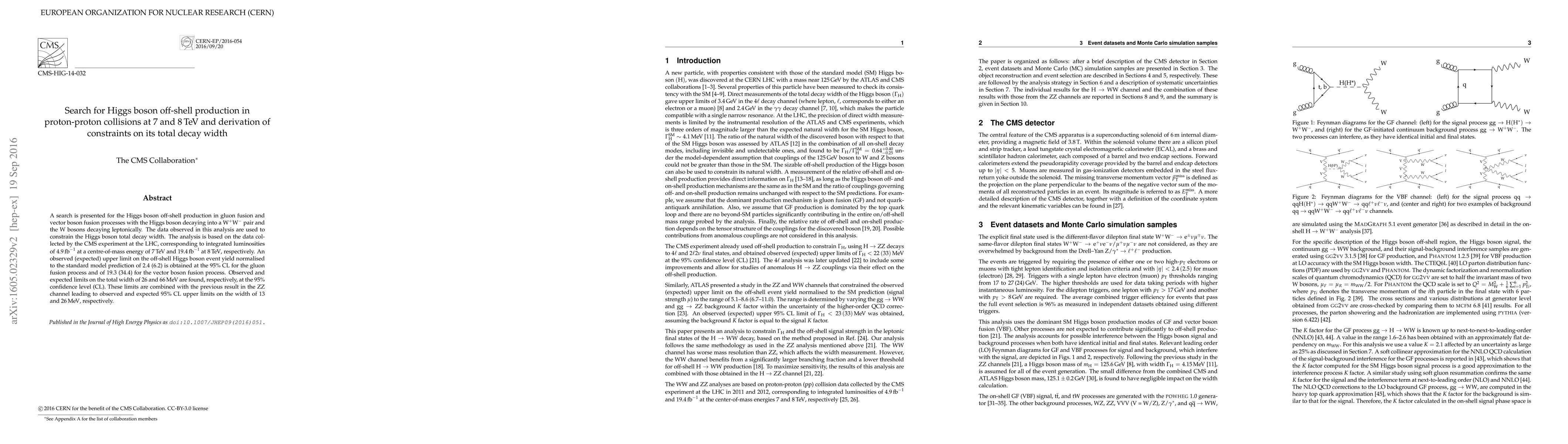 This paper reports a search for off-shell Higgs boson production in proton-proton collisions at 7 and 8 TeV using the CMS experiment data, focusing on decay into W+W- pairs. It derives constraints on the Higgs boson's total decay width, finding observed upper limits of 13 MeV and expected limits of 26 MeV at 95% confidence level.