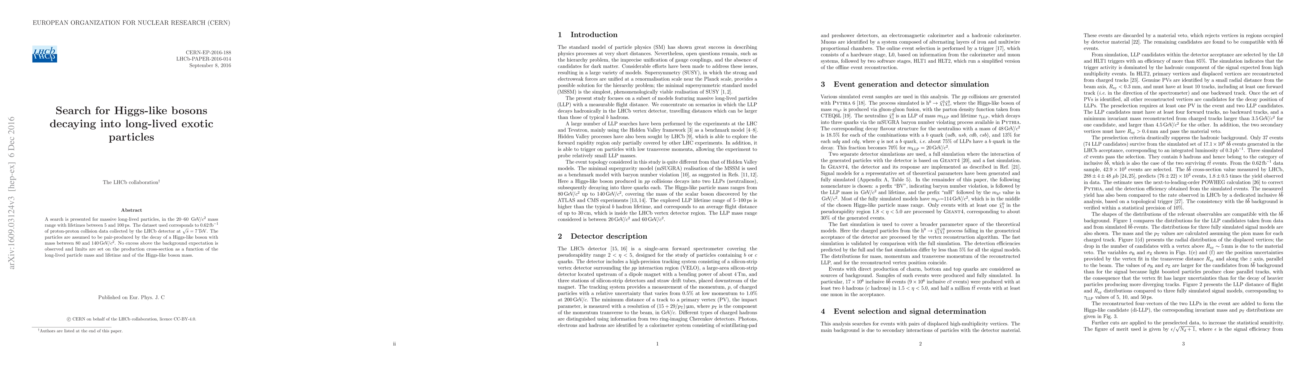 A search is presented for massive long-lived particles, in the 20-60 GeV mass range with lifetimes between 5 and 100 ps. The dataset used corresponds to 0.62 1\fb of proton-proton collision data collected by the LHCb detector at sqrt(s)=7 TeV. The particles are assumed to be pair-produced by the decay of a Higgs-like boson with mass between 80 and 140 GeV. No excess above the background expectation is observed and limits are set on the production cross-section as a function of the long-lived particle mass and lifetime and of the Higgs-like boson mass.