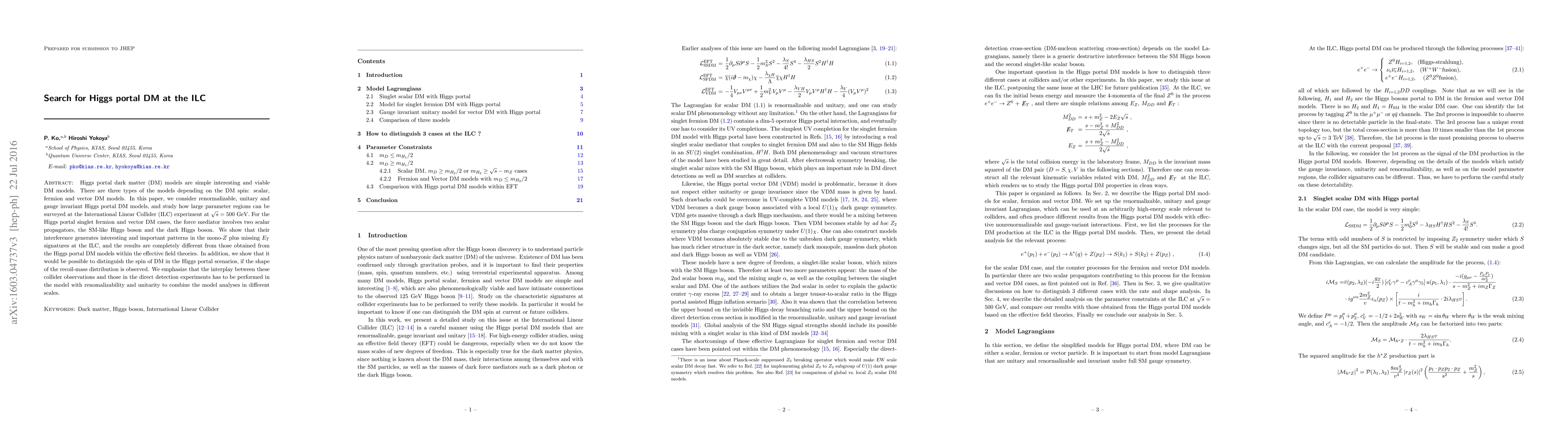 Higgs portal dark matter (DM) models are simple interesting and viable DM models. There are three types of the models depending on the DM spin: scalar, fermion and vector DM models. In this paper, we consider renormalizable, unitary and gauge invariant Higgs portal DM models, and study how large parameter regions can be surveyed at the International Linear Collider (ILC) experiment at $\sqrt{s}=500$ GeV. For the Higgs portal singlet fermion and vector DM cases, the force mediator involves two scalar propagators, the SM-like Higgs boson and the dark Higgs boson. We show that their interference generates interesting and important patterns in the mono-$Z$ plus missing $E_T$ signatures at the ILC, and the results are completely different from those obtained from the Higgs portal DM models within the effective field theories. In addition, we show that it would be possible to distinguish the spin of DM in the Higgs portal scenarios, if the shape of the recoil-mass distribution is observed. We emphasize that the interplay between these collider observations and those in the direct detection experiments has to be performed in the model with renomalizability and unitarity to combine the model analyses in different scales.