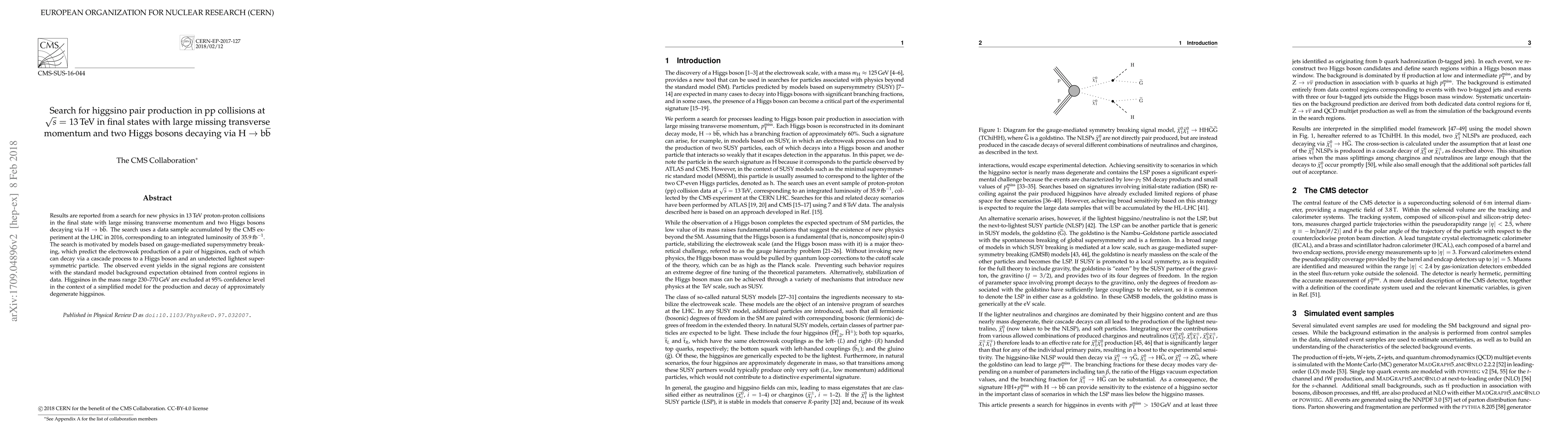 Results are reported from a search for new physics in 13 TeV proton-proton collisions in the final state with large missing transverse momentum and two Higgs bosons decaying via H to bb-bar. The search uses a data sample accumulated by the CMS experiment at the LHC in 2016, corresponding to an integrated luminosity of 35.9 inverse femtobarns. The search is motivated by models based on gauge-mediated supersymmetry breaking, which predict the electroweak production of a pair of higgsinos, each of which can decay via a cascade process to a Higgs boson and an undetected lightest supersymmetric particle. The observed event yields in the signal regions are consistent with the standard model background expectation obtained from control regions in data. Higgsinos in the mass range 230-770 GeV are excluded at 95% confidence level in the context of a simplified model for the production and decay of approximately degenerate higgsinos.