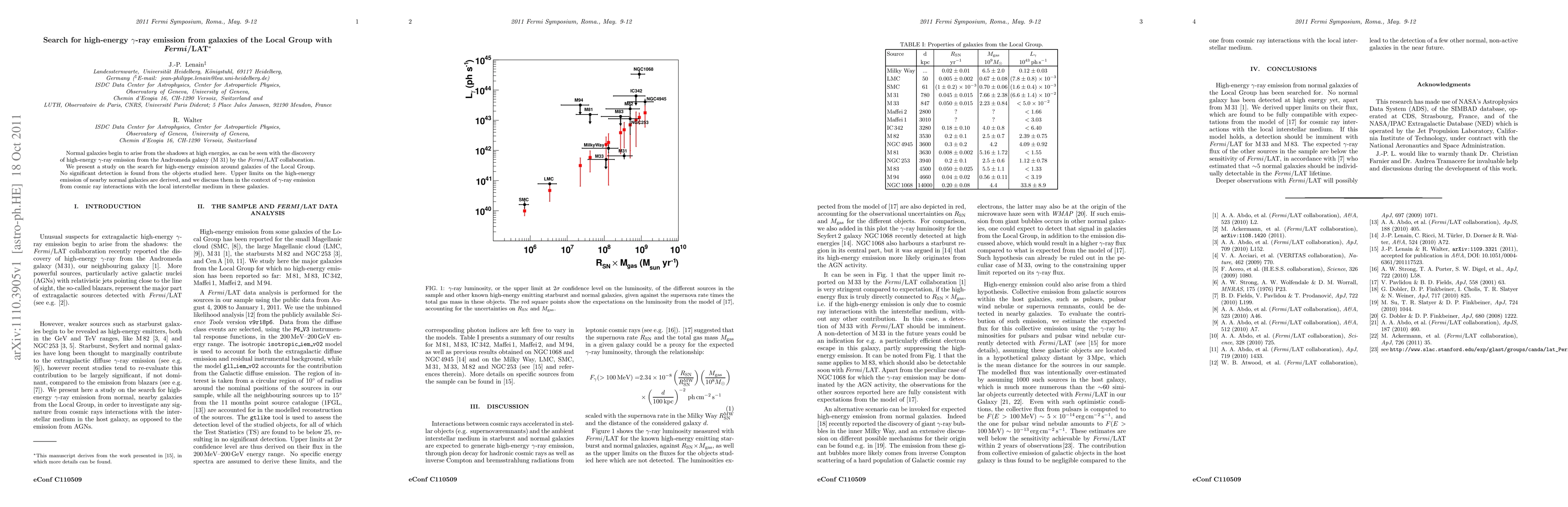 Normal galaxies begin to arise from the shadows at high energies, as can be seen with the discovery of high-energy gamma-ray emission from the Andromeda galaxy (M 31) by the Fermi /LAT collaboration. We present a study on the search for high-energy emission around galaxies of the Local Group. No significant detection is found from the objects studied here. Upper limits on the high-energy emission of nearby normal galaxies are derived, and we discuss them in the context of gamma-ray emission from cosmic ray interactions with the local interstellar medium in these galaxies.