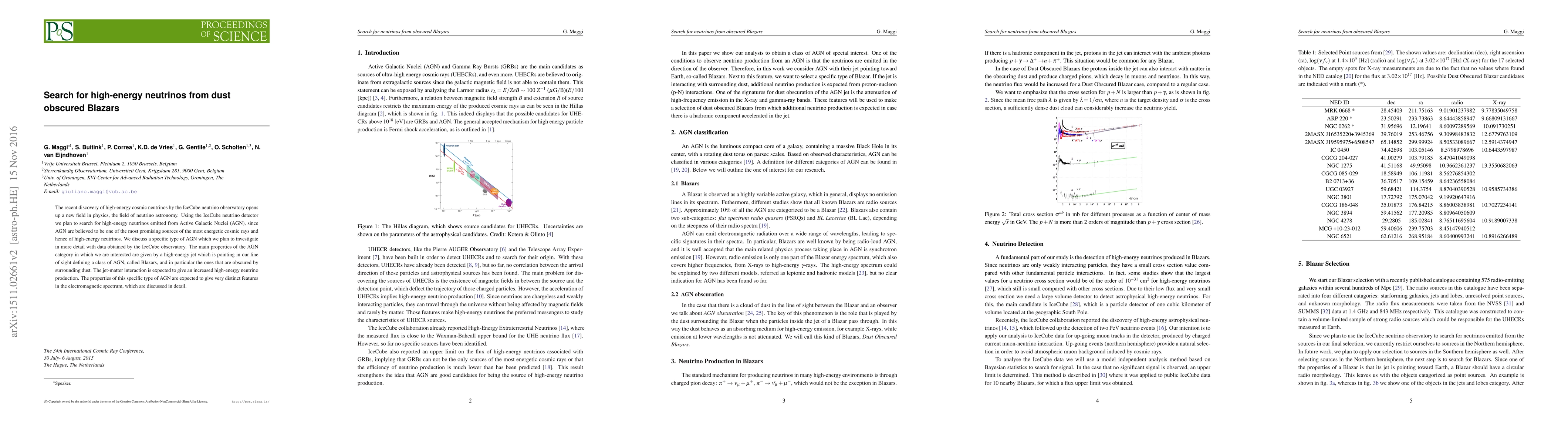 The recent discovery of high-energy cosmic neutrinos by the IceCube neutrino observatory opens up a new field in physics, the field of neutrino astronomy. Using the IceCube neutrino detector we plan to search for high-energy neutrinos emitted from Active Galactic Nuclei (AGN), since AGN are believed to be one of the most promising sources of the most energetic cosmic rays and hence of high-energy neutrinos. We discuss a specific type of AGN which we plan to investigate in more detail with data obtained by the IceCube observatory. The main properties of the AGN category in which we are interested are given by a high-energy jet which is pointing in our line of sight defining a class of AGN, called Blazars, and in particular the ones that are obscured by surrounding dust. The jet-matter interaction is expected to give an increased high-energy neutrino production. The properties of this specific type of AGN are expected to give very distinct features in the electromagnetic spectrum, which are discussed in detail.