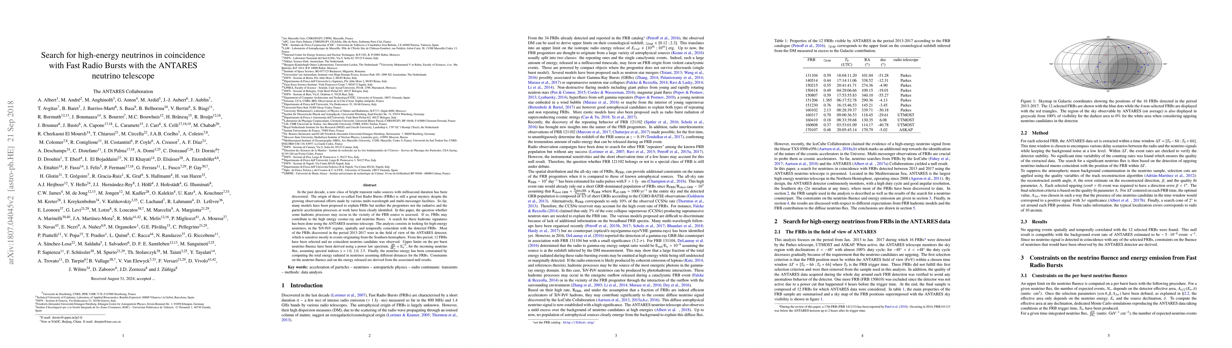 In the past decade, a new class of bright transient radio sources with millisecond duration has been discovered. The origin of these so-called Fast Radio Bursts (FRBs) is still a great mystery despite the growing observational efforts made by various multi-wavelength and multi-messenger facilities. So far, many models have been proposed to explain FRBs but neither the progenitors nor the radiative and the particle acceleration processes at work have been clearly identified. In this paper, the question whether some hadronic processes may occur in the vicinity of the FRB source is assessed. If so, FRBs may contribute to the high energy cosmic-ray and neutrino fluxes. A search for these hadronic signatures has been done using the ANTARES neutrino telescope. The analysis consists in looking for high-energy neutrinos, in the TeV-PeV regime, spatially and temporally coincident with the detected FRBs. Most of the FRBs discovered in the period 2013-2017 were in the field of view of the ANTARES detector, which is sensitive mostly to events originating from the Southern hemisphere. From this period, 12 FRBs have been selected and no coincident neutrino candidate was observed. Upper limits on the per burst neutrino fluence have been derived using a power law spectrum, $\rm{\frac{dN}{dE_\nu}\propto E_\nu^{-\gamma}}$, for the incoming neutrino flux, assuming spectral indexes $\gamma$ = 1.0, 2.0, 2.5. Finally, the neutrino energy has been constrained by computing the total energy radiated in neutrinos assuming different distances for the FRBs. Constraints on the neutrino fluence and on the energy released are derived from the associated null results.