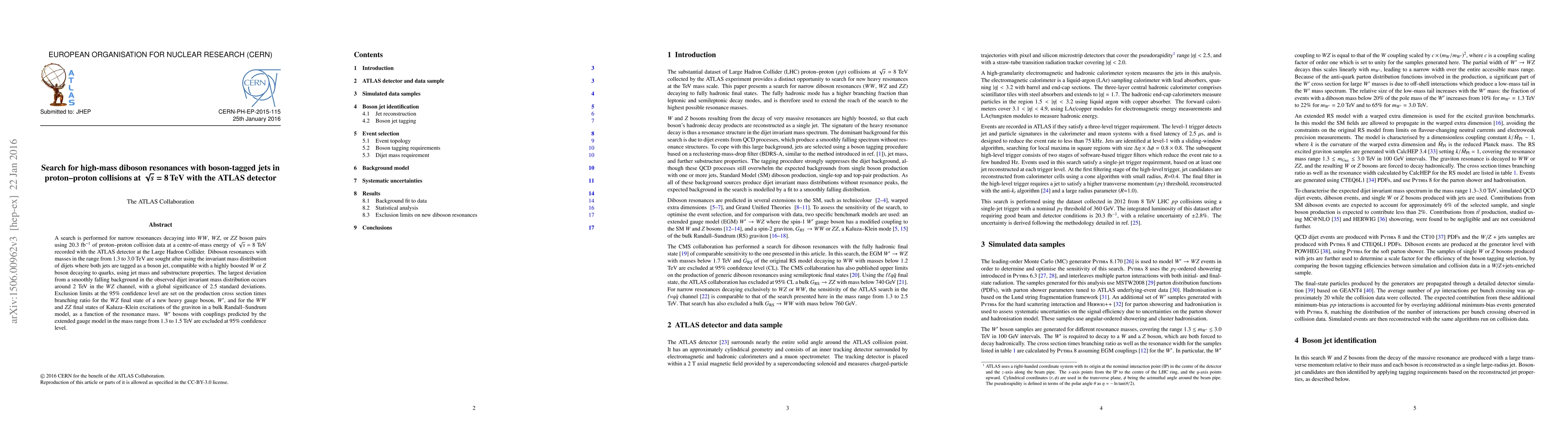 The ATLAS detector study at LHC's 8 TeV proton-proton collisions searched for heavy diboson resonances (WW, WZ, ZZ) decaying into highly boosted boson jets. A significant excess at 2 TeV was observed in the WZ channel with 2.5 standard deviations. Limits were set on extended gauge models and Randall-Sundrum graviton models, excluding W' bosons in the 1.3-1.5 TeV range with 95% confidence.