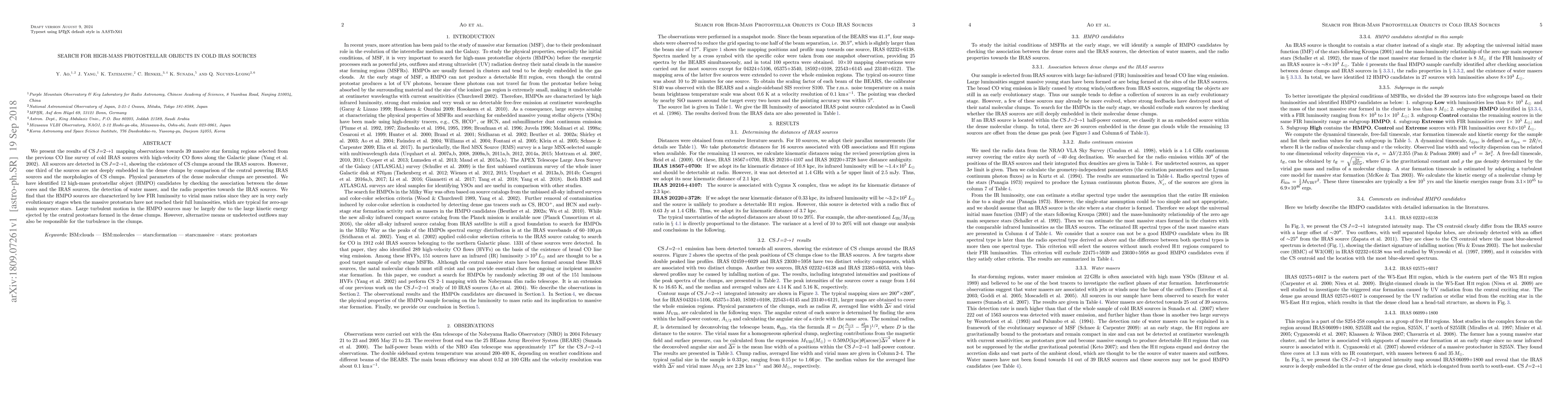 This study identifies 12 high-mass protostellar object (HMPO) candidates in 39 massive star-forming regions selected from cold IRAS sources, revealing early evolutionary stages characterized by low FIR luminosity to virial mass ratios. The turbulence in these regions may stem from kinetic energy ejected by protostars or undetected outflows.