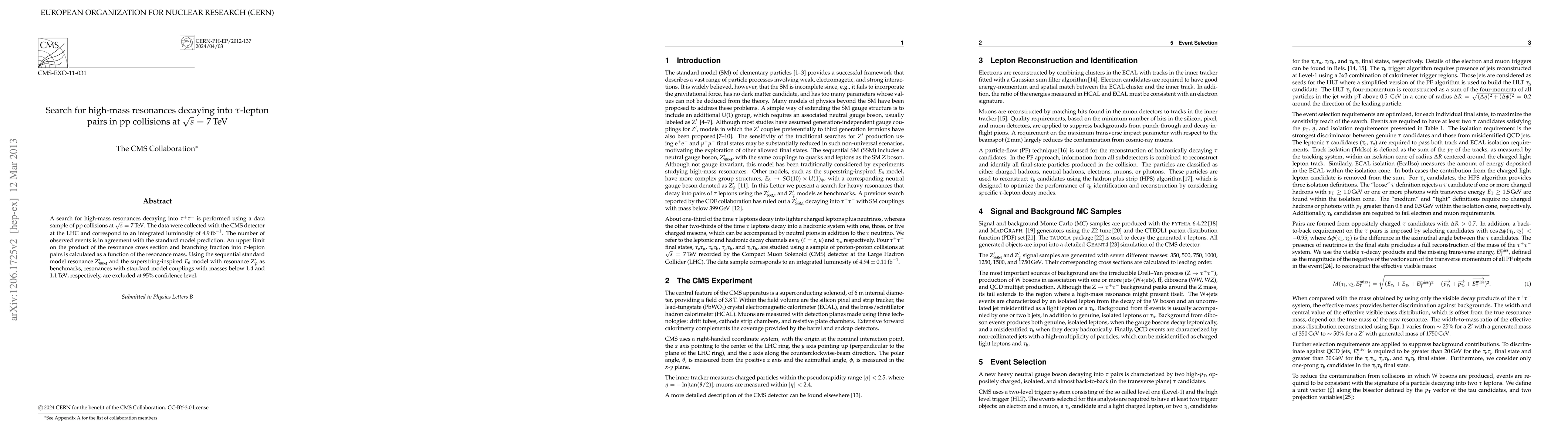 This paper reports a search for high-mass resonances decaying into tau-lepton pairs using data from pp collisions at 7 TeV from the CMS detector at the LHC. No significant deviations from the standard model prediction were observed, leading to exclusion limits for Z' resonances in the ZSSM and E(6) models below 1.4 TeV and 1.1 TeV, respectively, at 95% confidence level.