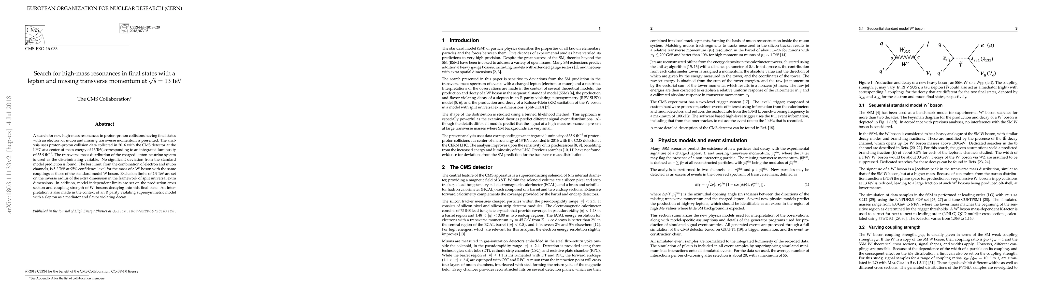 A search for new high-mass resonances in proton-proton collisions having final states with an electron or muon and missing transverse momentum is presented. The analysis uses proton-proton collision data collected in 2016 with the CMS detector at the LHC at a center-of-mass energy of 13 TeV, corresponding to an integrated luminosity of 35.9 fb$^{-1}$. The transverse mass distribution of the charged lepton-neutrino system is used as the discriminating variable. No significant deviation from the standard model prediction is found. The best limit, from the combination of electron and muon channels, is 5.2 TeV at 95% confidence level for the mass of a W$'$ boson with the same couplings as those of the standard model W boson. Exclusion limits of 2.9 TeV are set on the inverse radius of the extra dimension in the framework of split universal extra dimensions. In addition, model-independent limits are set on the production cross section and coupling strength of W$'$ bosons decaying into this final state. An interpretation is also made in the context of an R parity violating supersymmetric model with a slepton as a mediator and flavor violating decay.