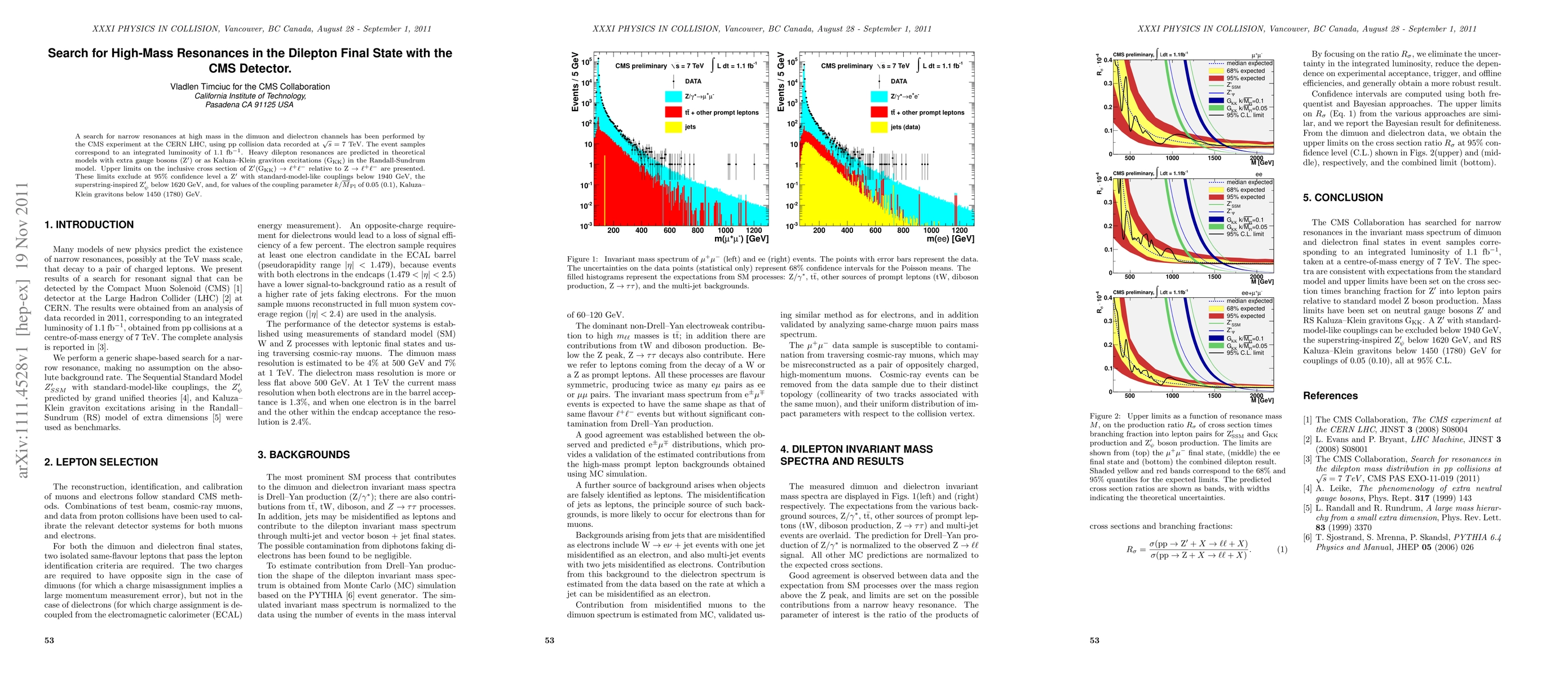 The CMS experiment at the CERN LHC searched for high-mass resonances in dilepton final states using 7 TeV pp collision data, setting upper limits on the cross sections for Z' and Kaluza-Klein gravitons, excluding Z' below 1940 GeV and KK gravitons below 1450 GeV for certain coupling values.