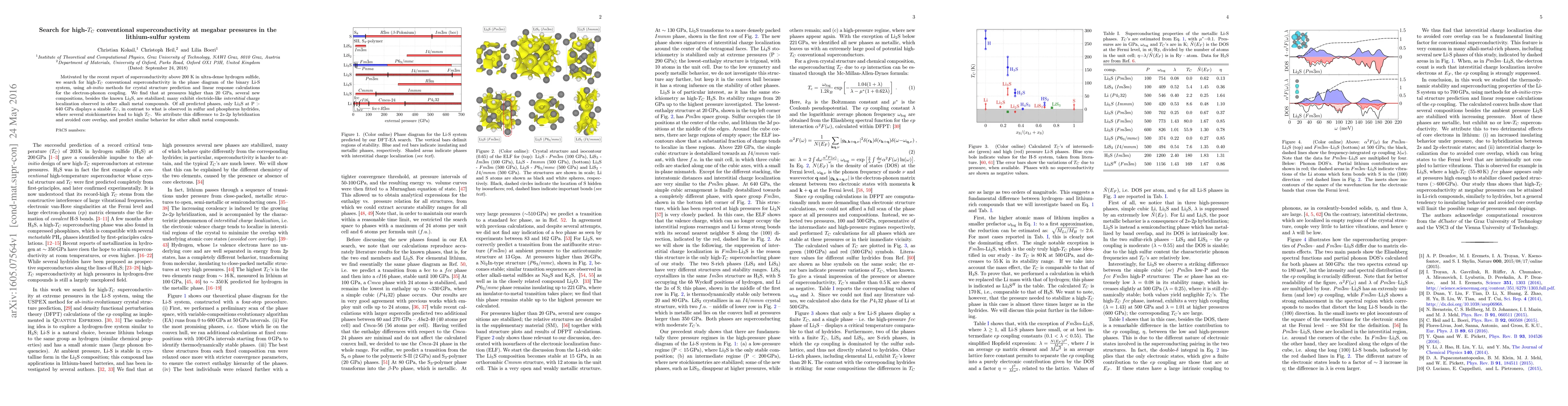 Motivated by the recent report of superconductivity above 200 K in ultra-dense hydrogen sulfide, we search for high-\tc\ conventional superconductivity in the phase diagram of the binary Li-S system, using {\em ab-initio} methods for crystal structure prediction and linear response calculations for the electron-phonon coupling. We find that at pressures higher than 20 GPa, several new compositions, besides the known Li$_2$S, are stabilized; many exhibit electride-like {\em interstitial} charge localization observed in other alkali metal compounds. Of all predicted phases, only Li$_3$S at P > 640 GPa displays a sizable \tc, in contrast to what is observed in sulfur and phosphorus hydrides, where several stoichiometries lead to high \tc. We attribute this difference to 2$s$-2$p$ hybridization and avoided core overlap, and predict similar behavior for other alkali metal compounds.