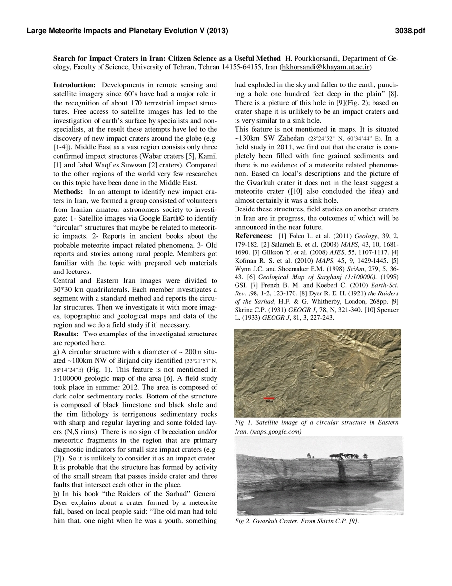 Summary: This study explores potential impact craters in Iran using Google Earth data, identifying probable structures; however, initial findings suggest non-impact origins for some, while further investigation into other craters is ongoing. Citizen science involvement is noted as a useful method in this research.