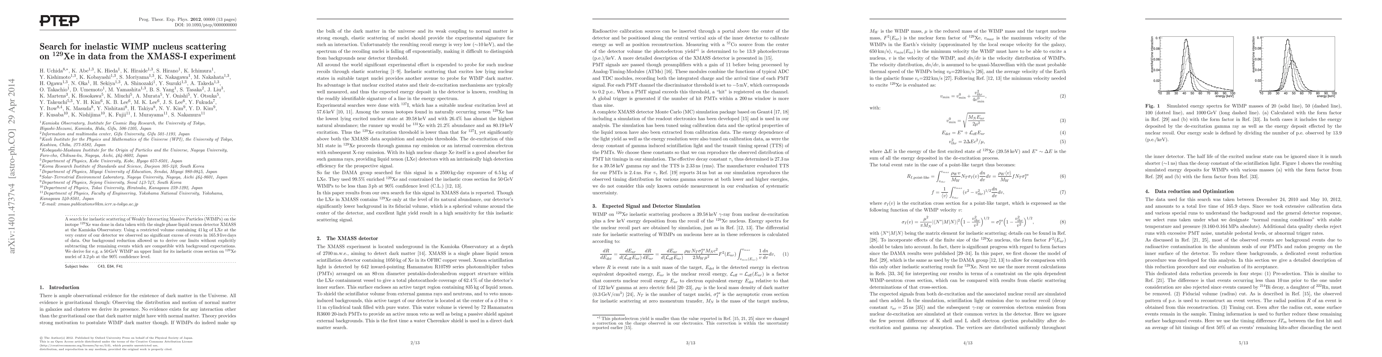 A search for inelastic scattering of Weakly Interacting Massive Particles (WIMPs) on the isotope $^{129}$Xe was done in data taken with the single phase liquid xenon detector XMASS at the Kamioka Observatory. Using a restricted volume containing 41 kg of LXe at the very center of our detector we observed no significant excess of events in 165.9 days of data. Our background reduction allowed us to derive our limits without explicitly subtracting the remaining events which are compatible with background expectations and derive for e.g. a 50 GeV WIMP an upper limit for its inelastic cross section on $^{129}$Xe nuclei of 3.2 pb at the 90% confidence level.