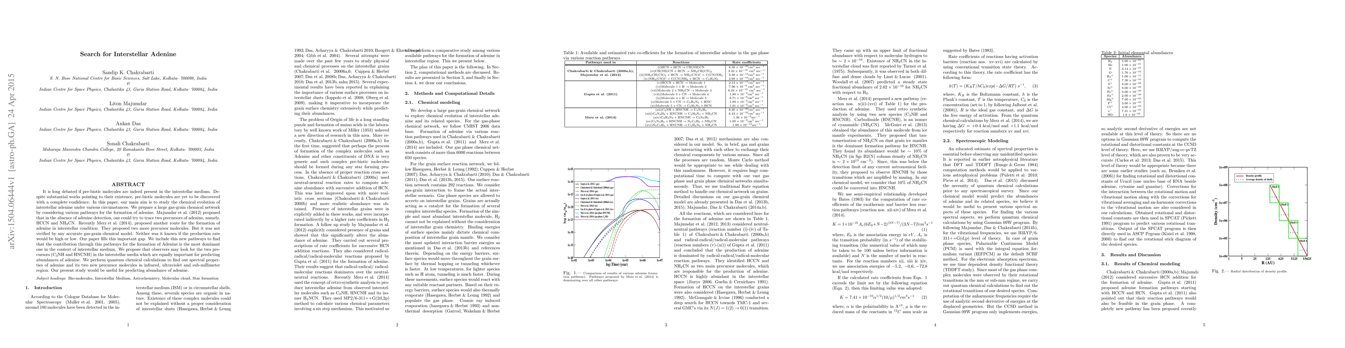 It is long debated if pre-biotic molecules are indeed present in the interstellar medium. Despite substantial works pointing to their existence, pre-biotic molecules are yet to be discovered with a complete confidence. In this paper, our main aim is to study the chemical evolution of interstellar adenine under various circumstances. We prepare a large gas-grain chemical network by considering various pathways for the formation of adenine. Majumdar et al. (2012) proposed that in the absence of adenine detection, one could try to trace two precursors of adenine, namely, HCCN and NH_2CN. Recently Merz et al. (2014), proposed another route for the formation of adenine in interstellar condition. They proposed two more precursor molecules. But it was not verified by any accurate gas-grain chemical model. Neither was it known if the production rate would be high or low. Our paper fills this important gap. We include this new pathways to find that the contribution through this pathways for the formation of Adenine is the most dominant one in the context of interstellar medium. We propose that observers may look for the two precursors (C_3NH and HNCNH) in the interstellar media which are equally important for predicting abundances of adenine. We perform quantum chemical calculations to find out spectral properties of adenine and its two new precursor molecules in infrared, ultraviolet and sub-millimeter region. Our present study would be useful for predicting abundance of adenine.