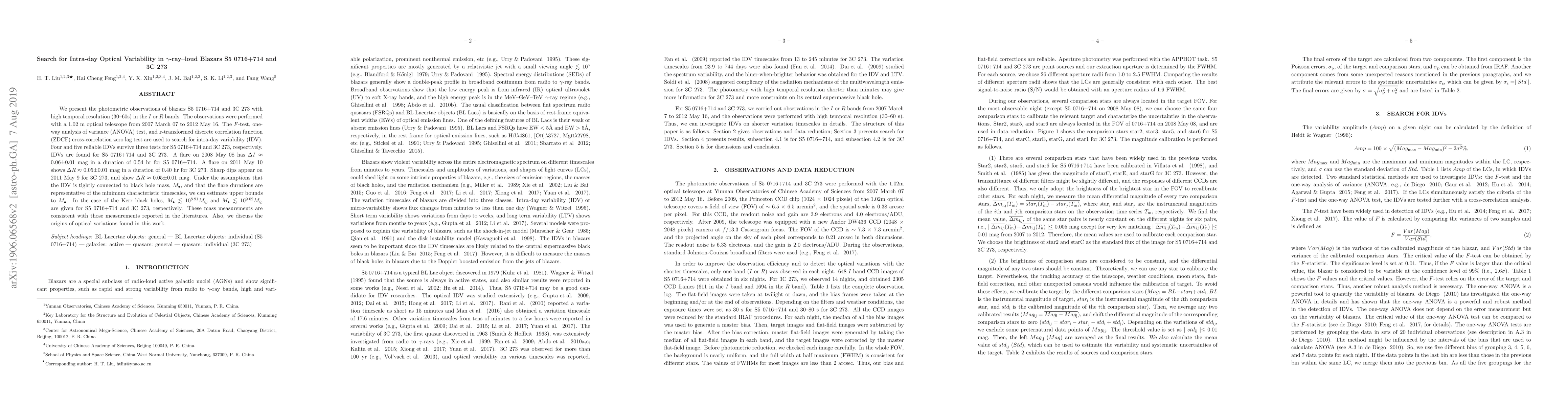 We present the photometric observations of blazars S5 0716+714 and 3C 273 with high temporal resolution (30--60s) in the $I$ or $R$ bands. The observations were performed with a 1.02 m optical telescope from 2007 March 07 to 2012 May 16. The $F$-test, one-way analysis of variance (ANOVA) test, and $z$-transformed discrete correlation function (ZDCF) cross-correlation zero lag test are used to search for intra-day variability (IDV). Four and five reliable IDVs survive three tests for S5 0716+714 and 3C 273, respectively. IDVs are found for S5 0716+714 and 3C 273. A flare on 2008 May 08 has $\Delta I \approx$ 0.06$\pm$0.01 mag in a duration of 0.54 hr for S5 0716+714. A flare on 2011 May 10 shows $\Delta R \approx$ 0.05$\pm$0.01 mag in a duration of 0.40 hr for 3C 273. Sharp dips appear on 2011 May 9 for 3C 273, and show $\Delta R \approx$ 0.05$\pm$0.01 mag. Under the assumptions that the IDV is tightly connected to black hole mass, $M_{\bullet}$, and that the flare durations are representative of the minimum characteristic timescales, we can estimate upper bounds to $M_{\bullet}$. In the case of the Kerr black holes, $M_{\bullet} \la 10^{8.91} M_{\odot}$ and $M_{\bullet} \la 10^{9.02} M_{\odot}$ are given for S5 0716+714 and 3C 273, respectively. These mass measurements are consistent with those measurements reported in the literatures. Also, we discuss the origins of optical variations found in this work.