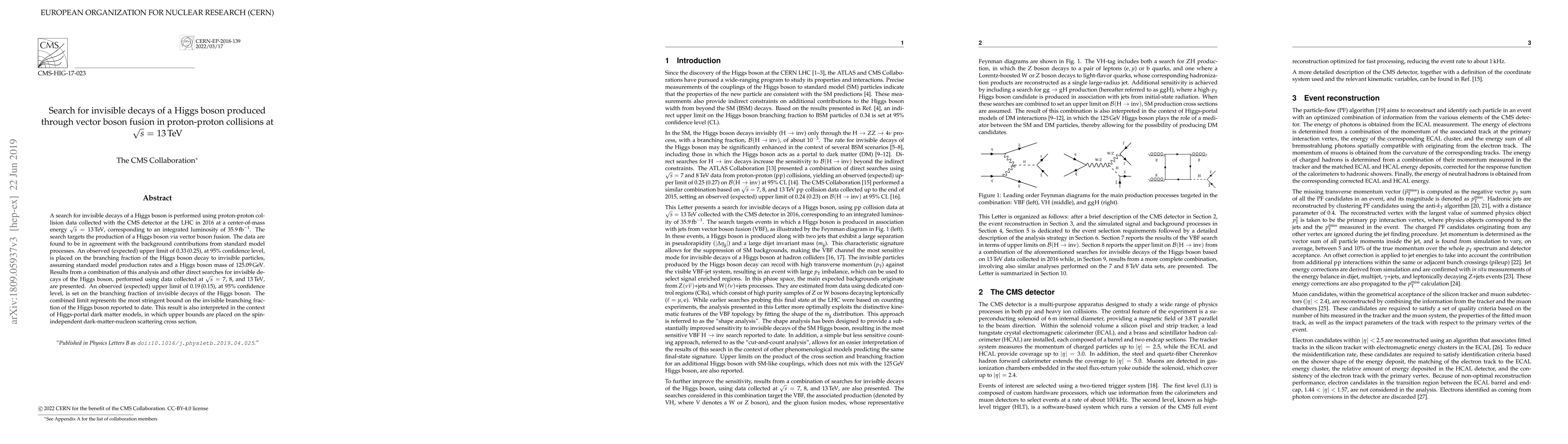 This paper investigates invisible decays of a Higgs boson produced via vector boson fusion in proton-proton collisions at 13 TeV using CMS detector data. The analysis sets the most stringent upper limit on the Higgs boson's invisible branching fraction to date, improving constraints on Higgs-portal dark matter models.